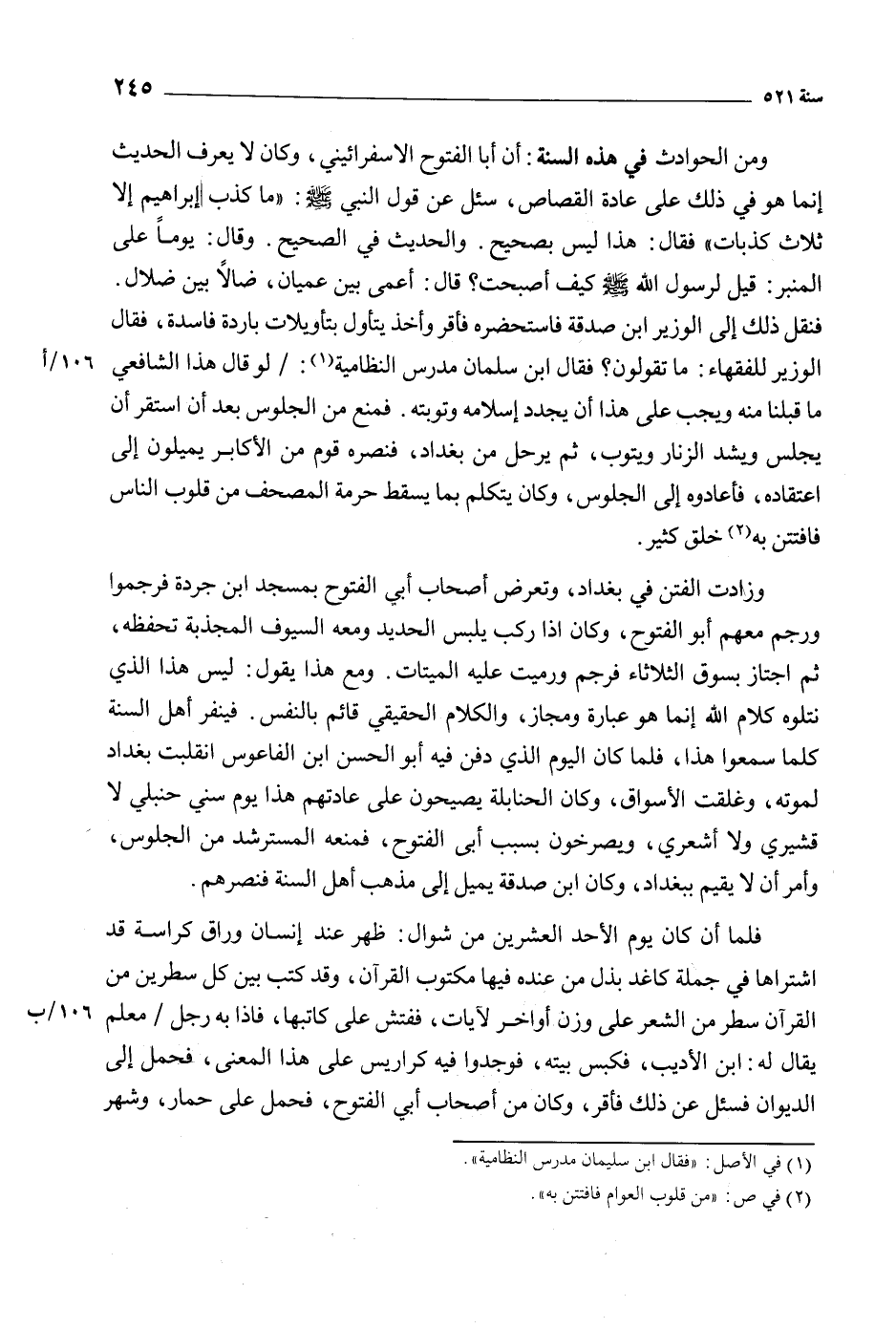 ومن الحوادث في هذه السنة: أن أبا الفتوح الأسفراييني، وكان لا يعرف الحديث إنما هو في ذلك على عادة القصاص، سئل عن قول النبي صلى الله عليه وسلم: «ما كذب إبراهيم إلا ثلاث كذبات» فقال: هذا ليس بصحيح. والحديث في الصحيح. وقال: يوما على المنبر: قيل لرسول الله صلى الله عليه وسلم كيف أصبحت؟ قال: أعمى بين عميان، ضالا بين ضلال. فنقل ذلك إلى الوزير ابن صدقة فاستحضره فأقر وأخذ يتأول بتأويلات باردة فاسدة، فقال الوزير للفقهاء: ما تقولون؟ فقال ابن سلمان مدرس النظامية [1] : / لو قال هذا الشافعيّ 106/ أما قبلنا منه ويجب على هذا أن يجدد إسلامه وتوبته. فمنع من الجلوس بعد أن استقر أن يجلس ويشد الزنار ويتوب، ثم يرحل من بغداد، فنصره قوم من الأكابر يميلون إلى اعتقاده، فأعادوه إلى الجلوس، وكان يتكلم بما يسقط حرمة المصحف من قلوب الناس فافتتن به [2] خلق كثير.