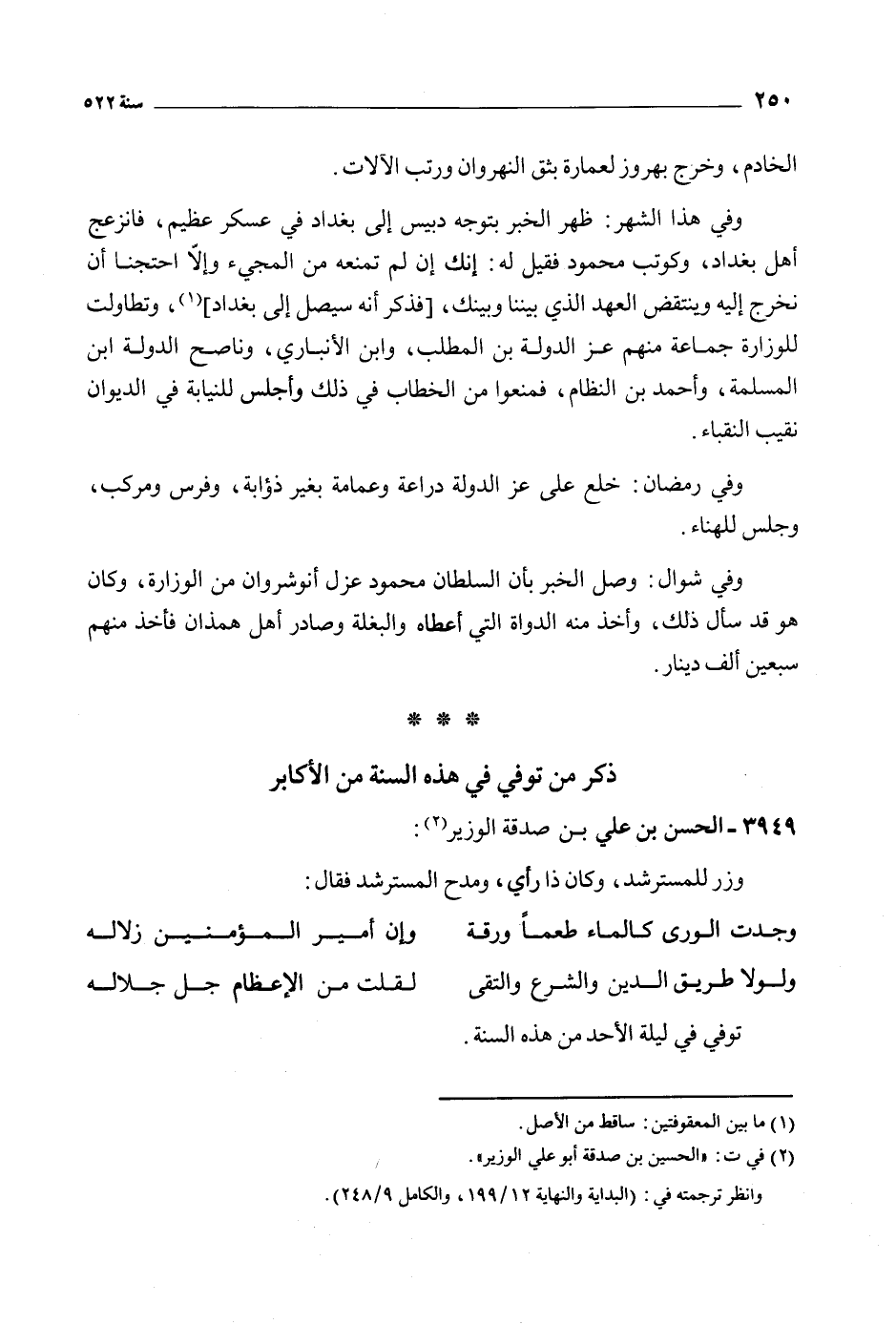 وفي هذا الشهر: ظهر الخبر بتوجه دبيس إلى بغداد في عسكر عظيم، فانزعج أهل بغداد، وكوتب محمود فقيل له: إنك إن لم تمنعه من المجيء والا احتجنا أن نخرج إليه وينتقض العهد الذي بيننا وبينك، [فذكر أنه سيصل إلى بغداد] [1] ، وتطاولت للوزارة جماعة منهم عز الدولة بن المطلب، وابن الأنباري، وناصح الدولة ابن المسلمة، وأحمد بن النظام، فمنعوا من الخطاب في ذلك واجلس للنيابة في الديوان نقيب النقباء.
