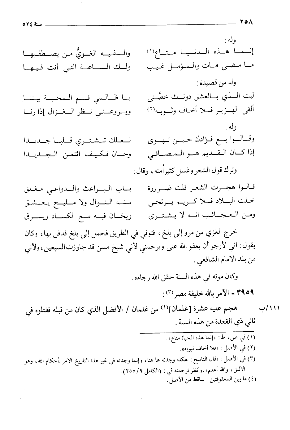 [3] في الأصل: «قال الناسخ: هكذا وجدته ها هنا، وإنما وجدته في غير هذا التاريخ الآمر بأحكام الله، وهو الأليق، والله أعلم» . وانظر ترجمته في: (الكامل 9/ 255) .