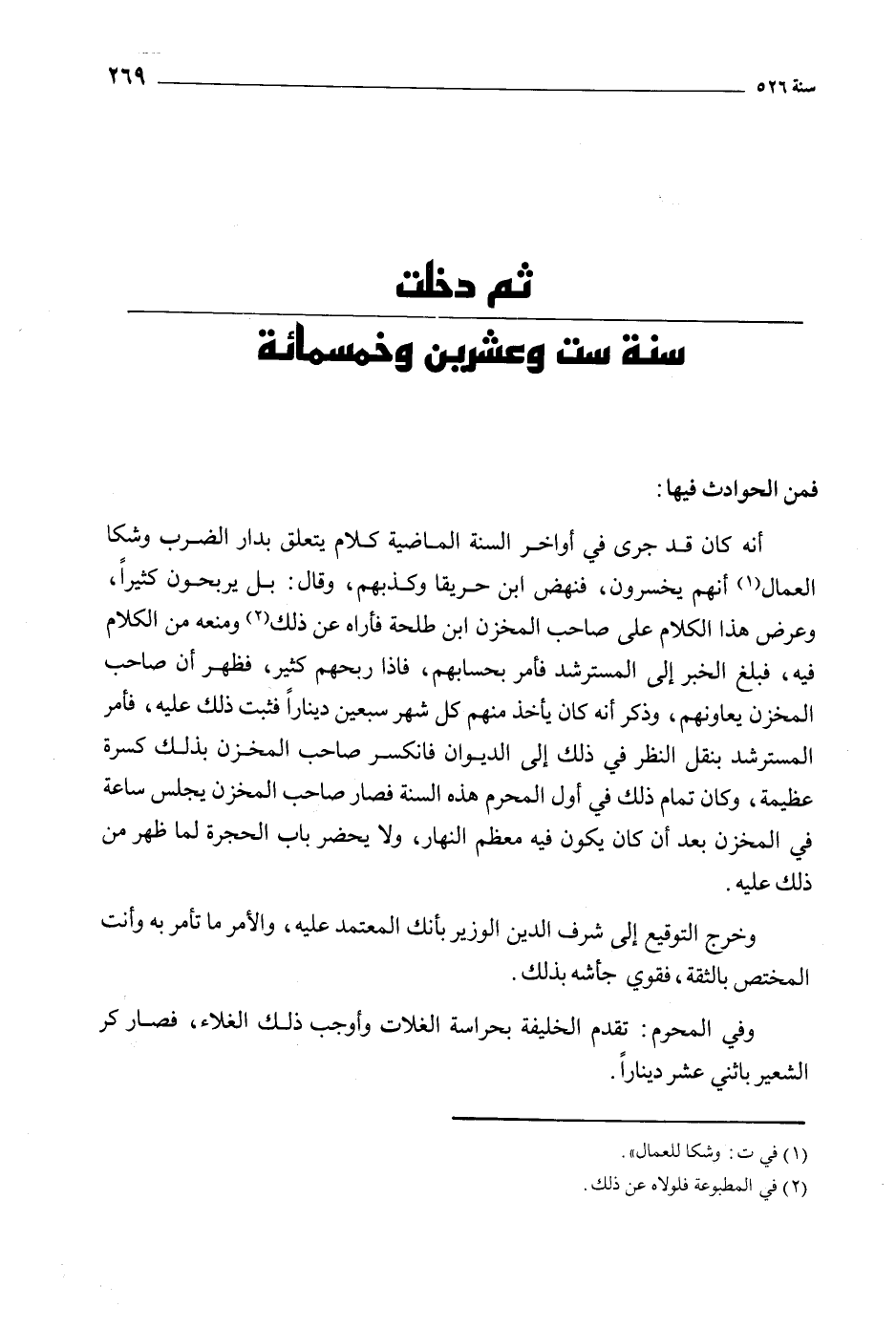 أنه كان قد جرى في أواخر السنة الماضية كلام يتعلق بدار الضرب وشكا العمال [1] أنهم يخسرون، فنهض ابن حريقا وكذبهم، وقال: بل يربحون كثيرا، وعرض هذا الكلام على صاحب المخزن ابن طلحة فأراه عن ذلك [2] ومنعه من الكلام فيه، فبلغ الخبر إلى المسترشد فأمر بحسابهم، فإذا ربحهم كثير، فظهر أن صاحب المخزن يعاونهم، وذكر أنه كان يأخذ منهم كل شهر سبعين دينارا فثبت ذلك عليه، فأمر المسترشد بنقل النظر في ذلك إلى الديوان فانكسر صاحب المخزن بذلك كسرة عظيمة، وكان تمام ذلك في أول المحرم هذه السنة فصار صاحب المخزن يجلس ساعة في المخزن بعد أن كان يكون فيه معظم النهار، ولا يحضر باب الحجرة لما ظهر من ذلك عليه.