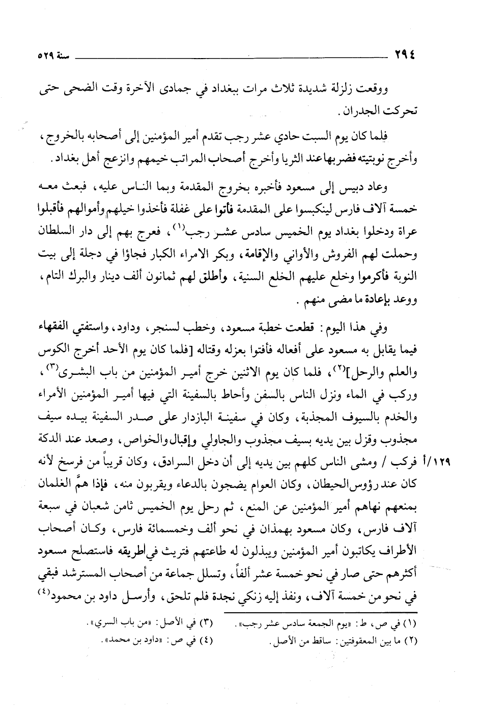 وفي هذا اليوم: قطعت خطبة مسعود، وخطب لسنجر، وداود، واستفتى الفقهاء فيما يقابل به مسعود على أفعاله فأفتوا بعزله وقتاله [فلما كان يوم الأحد أخرج الكوس والعلم والرحل] [2] ، فلما كان يوم الاثنين خرج أمير المؤمنين من باب البشرى [3] ، وركب في الماء ونزل الناس بالسفن وأحاط بالسفينة التي فيها أمير المؤمنين الأمراء والخدم بالسيوف المجذبة، وكان في سفينة البازدار على صدر السفينة بيده سيف مجذوب وقزل بين يديه بسيف مجذوب والجاولي وإقبال والخواص، وصعد عند الدكة 129/ أفركب/ ومشى الناس كلهم بين يديه إلى أن دخل السرادق، وكان قريبا من فرسخ لأنه كان عند رءوس الحيطان، وكان العوام يضجون بالدعاء ويقربون منه، فإذا هم الغلمان بمنعهم نهاهم أمير المؤمنين عن المنع، ثم رحل يوم الخميس ثامن شعبان في سبعة آلاف فارس، وكان مسعود بهمذان في نحو ألف وخمسمائة فارس، وكان أصحاب الأطراف يكاتبون أمير المؤمنين ويبذلون له طاعتهم فتريث في طريقه فاستصلح مسعود أكثرهم حتى صار في نحو خمسة عشر ألفا، وتسلل جماعة من أصحاب المسترشد فبقي في نحو من خمسة آلاف، ونفذ إليه زنكي نجدة فلم تلحق، وأرسل داود بن محمود [4]