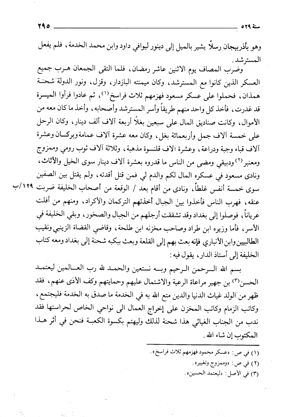 وضرب المصاف يوم الاثنين عاشر رمضان، فلما التقى الجمعان هرب جميع العسكر الذين كانوا مع المسترشد، وكان ميمنته البازدار، وقزل، ونور الدولة شحنة همذان، فحملوا على عسكر مسعود فهزمهم ثلاث فراسخ [1] ، ثم عادوا فرأوا الميسرة قد غدرت، فأخذ كل واحد منهم طريقا وأسر المسترشد وأصحابه، وأخذ ما كان معه من الأموال، وكانت صناديق المال على سبعين بغلا أربعة آلاف ألف دينار، وكان الرحل على خمسة آلاف جمل وأربعمائة بغل، وكان معه عشرة آلاف عمامة وبركان وعشرة آلاف قباء وجبة ودراعة، وعشرة آلاف قلنسوة مذهبة، وثلاثة آلاف ثوب رومي وممزوج ومعنبر [2] ودبيقي ومضى من الناس ما قدروه بعشرة آلاف دينار سوى الخيل والأثاث، ونادى مسعود في عسكره المال لكم والدم لي فمن قتل أقدته، ولم يقتل بين الصفين سوى خمسة أنفس غلطا، ونادى من أقام بعد/ الوقعة من أصحاب الخليفة ضربت 129/ ب عنقه، فهرب الناس فأخذوا بين الجبال أخذتهم التركمان والأكراد، ومنهم من أفلت عريانا، فوصلوا إلى بغداد وقد تشققت أرجلهم من الجبال والصخور، وبقي الخليفة في الأسر، فأما وزيره ابن طراد وصاحب مخزنه ابن طلحة، وقاضي القضاة الزينبي ونقيب الطالبيين وابن الأنباري فإنه بعث بهم إلى القلعة وبعث ببكبه شحنة إلى بغداد ومعه كتاب الخليفة إلى أستاذ الدار، يقول فيه: