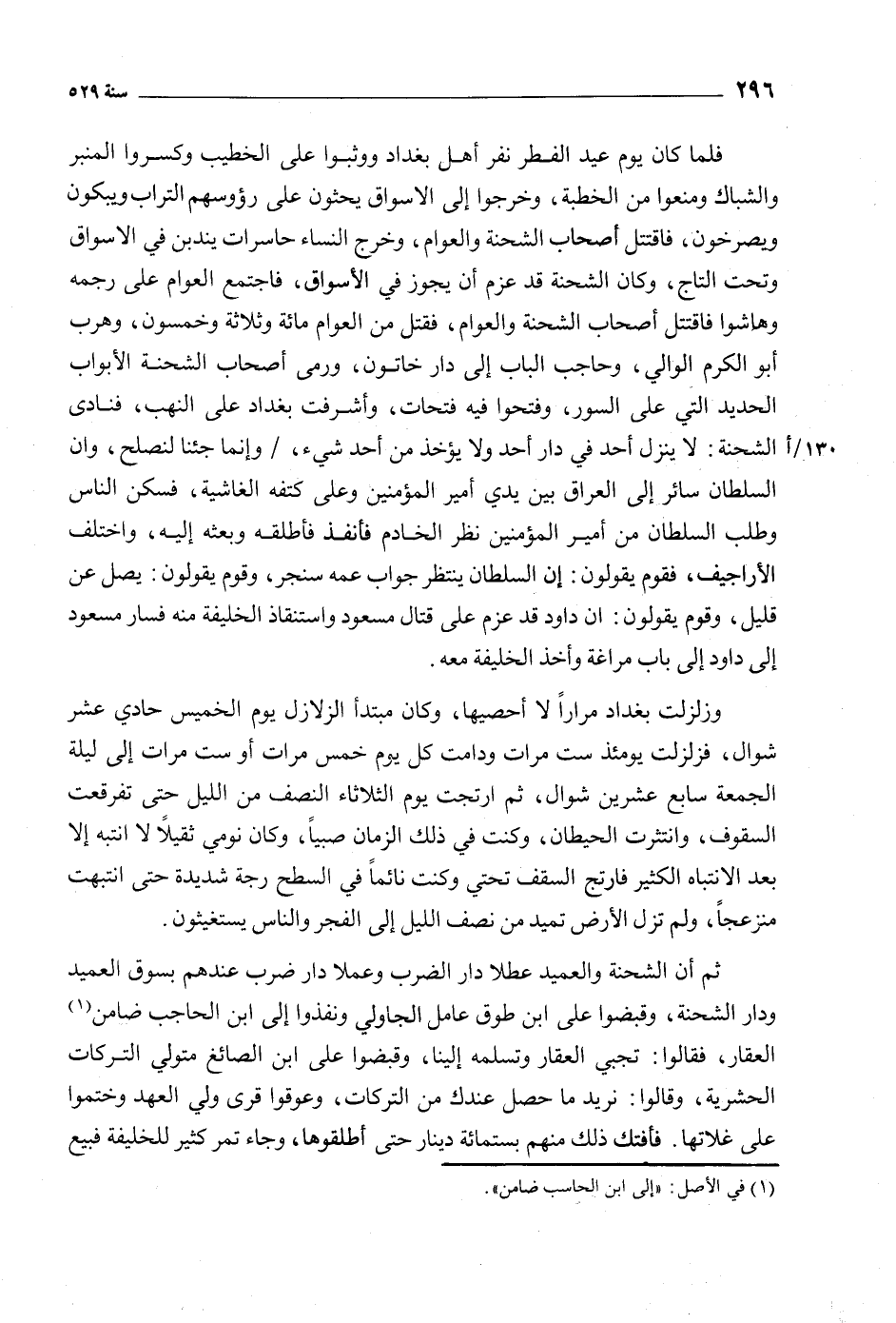 فلما كان يوم عيد الفطر نفر أهل بغداد ووثبوا على الخطيب وكسروا المنبر والشباك ومنعوا من الخطبة، وخرجوا إلى الأسواق يحثون على رءوسهم التراب ويبكون ويصرخون، فاقتتل أصحاب الشحنة والعوام، وخرج النساء حاسرات يندبن في الأسواق وتحت التاج، وكان الشحنة قد عزم أن يجوز في الأسواق، فاجتمع العوام على رجمه وهاشوا فاقتتل أصحاب الشحنة والعوام، فقتل من العوام مائة وثلاثة وخمسون، وهرب أبو الكرم الوالي، وحاجب الباب إلى دار خاتون، ورمى أصحاب الشحنة الأبواب الحديد التي على السور، وفتحوا فيه فتحات، وأشرفت بغداد على النهب، فنادى 130/ أالشحنة: لا ينزل أحد في دار أحد ولا يؤخذ من أحد شيء، / وإنما جئنا لنصلح، وأن السلطان سائر إلى العراق بين يدي أمير المؤمنين وعلى كتفه الغاشية، فسكن الناس وطلب السلطان من أمير المؤمنين نظر الخادم فانفذ فأطلقه وبعثه إليه، واختلف الأراجيف، فقوم يقولون: إن السلطان ينتظر جواب عمه سنجر، وقوم يقولون: يصل عن قليل، وقوم يقولون: ان داود قد عزم على قتال مسعود واستنقاذ الخليفة منه فسار مسعود إلى داود إلى باب مراغة واخذ الخليفة معه.