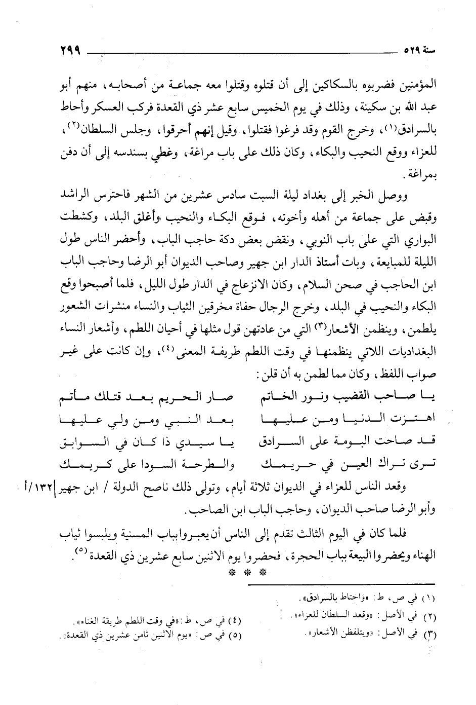 وقعد الناس للعزاء في الديوان ثلاثة أيام، وتولى ذلك ناصح الدولة/ ابن جهير/ 132/ أوأبو الرضا صاحب الديوان، وحاجب الباب ابن الصاحب.