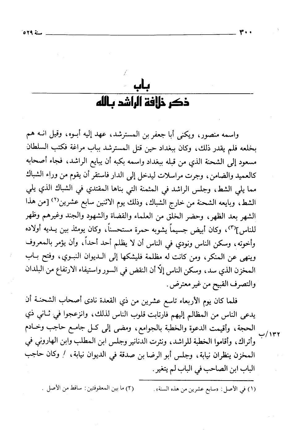 فلما كان يوم الأربعاء تاسع عشرين من ذي القعدة نادى أصحاب الشحنة أن يدعى الناس من المظالم إليهم فارتابت قلوب الناس لذلك، وانزعجوا في ثاني ذي الحجة، وأقيمت الدعوة والخطبة بالجوامع، ومضى إلى كل جامع حاجب وخادم 132/ ب وأتراك، وأقاموا الخطبة للراشد، ونثرت الدنانير وجلس ابن المطلب وابن الهاروني في المخزن ينظران نيابة، وجلس أبو الرضا بن صدقة في الديوان نيابة، / وكان حاجب الباب ابن الصاحب في الباب لم يتغير.