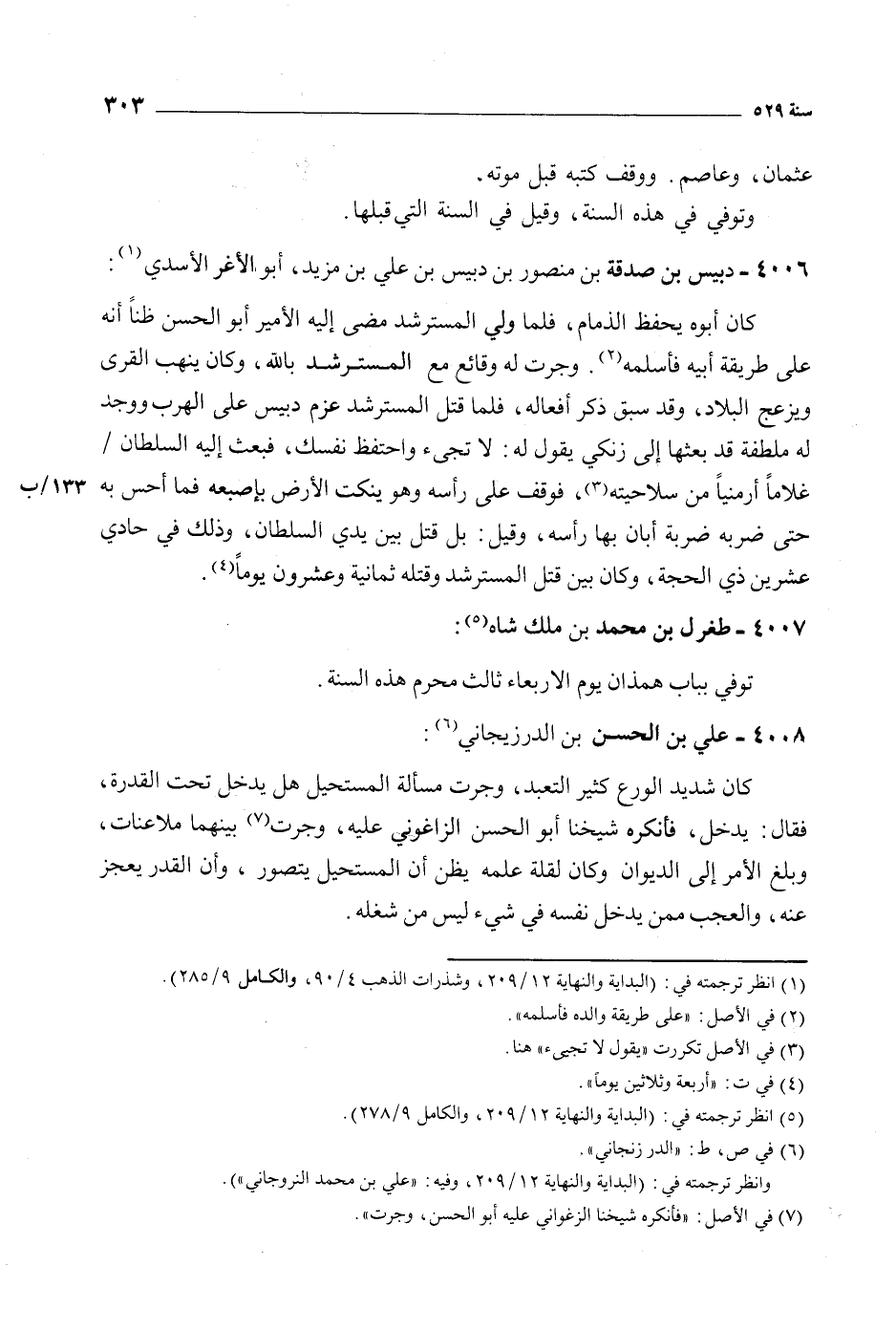 كان أبوه يحفظ الذمام، فلما ولي المسترشد مضى إليه الأمير أبو الحسن ظنا أنه على طريقة أبيه فأسلمه [2] . وجرت له وقائع مع المسترشد باللَّه، وكان ينهب القرى ويزعج البلاد، وقد سبق ذكر أفعاله، فلما قتل المسترشد عزم دبيس على الهرب ووجد له ملطفة قد بعثها إلى زنكي يقول له: لا تجيء واحتفظ نفسك، فبعث إليه السلطان/ غلاما أرمنيا من سلاحيته [3] ، فوقف على رأسه وهو ينكت الأرض بإصبعه فما أحس به 133/ ب حتى ضربه ضربة أبان بها رأسه، وقيل: بل قتل بين يدي السلطان، وذلك في حادي عشرين ذي الحجة، وكان بين قتل المسترشد وقتله ثمانية وعشرون يوما [4] .
