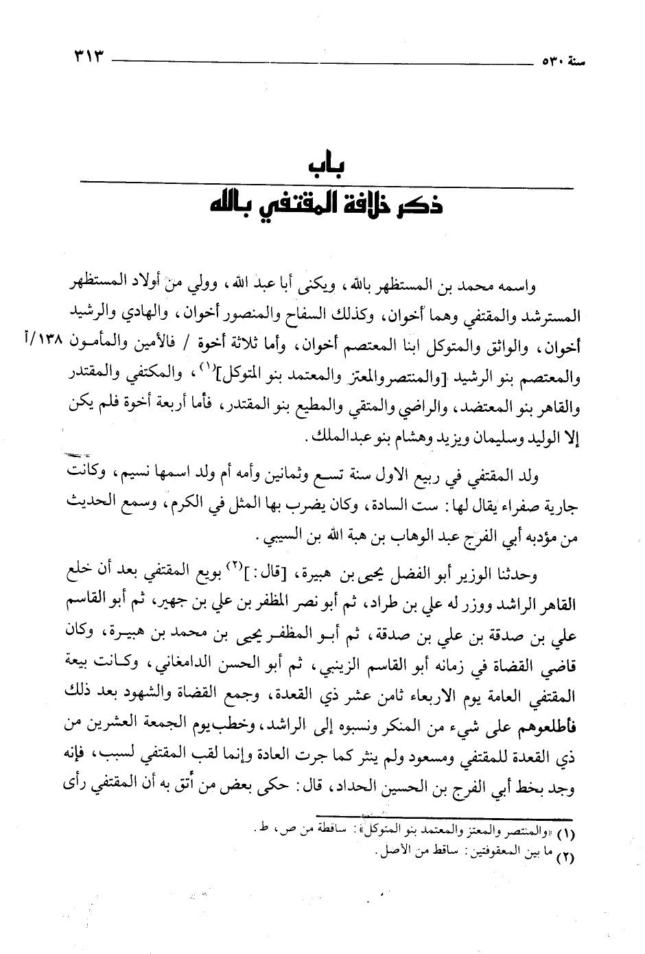 وحدثنا الوزير أبو الفضل يحيى بن هبيرة، [قال:] [2] بويع المقتفي بعد أن خلع القاهر الراشد ووزر له علي بن طراد، ثم أبو نصر المظفر بن علي بن جهير، ثم أبو القاسم علي بن صدقة بن علي بن صدقة، ثم أبو المظفر يحيى بن محمد بن هبيرة، وكان قاضي القضاة في زمانه أبو القاسم الزينبي، ثم أبو الحسن الدامغاني، وكانت بيعة المقتفي العامة يوم الأربعاء ثامن عشر ذي القعدة، وجمع القضاة والشهود بعد ذلك فأطلعوهم على شيء من المنكر ونسبوه إلى الراشد، وخطب يوم الجمعة العشرين من ذي القعدة للمقتفي ومسعود ولم ينثر كما جرت العادة وإنما لقب المقتفي لسبب، فإنه وجد بخط أبي الفرج بن الحسين الحداد، قال: حكى بعض من أثق به أن المقتفي رأى