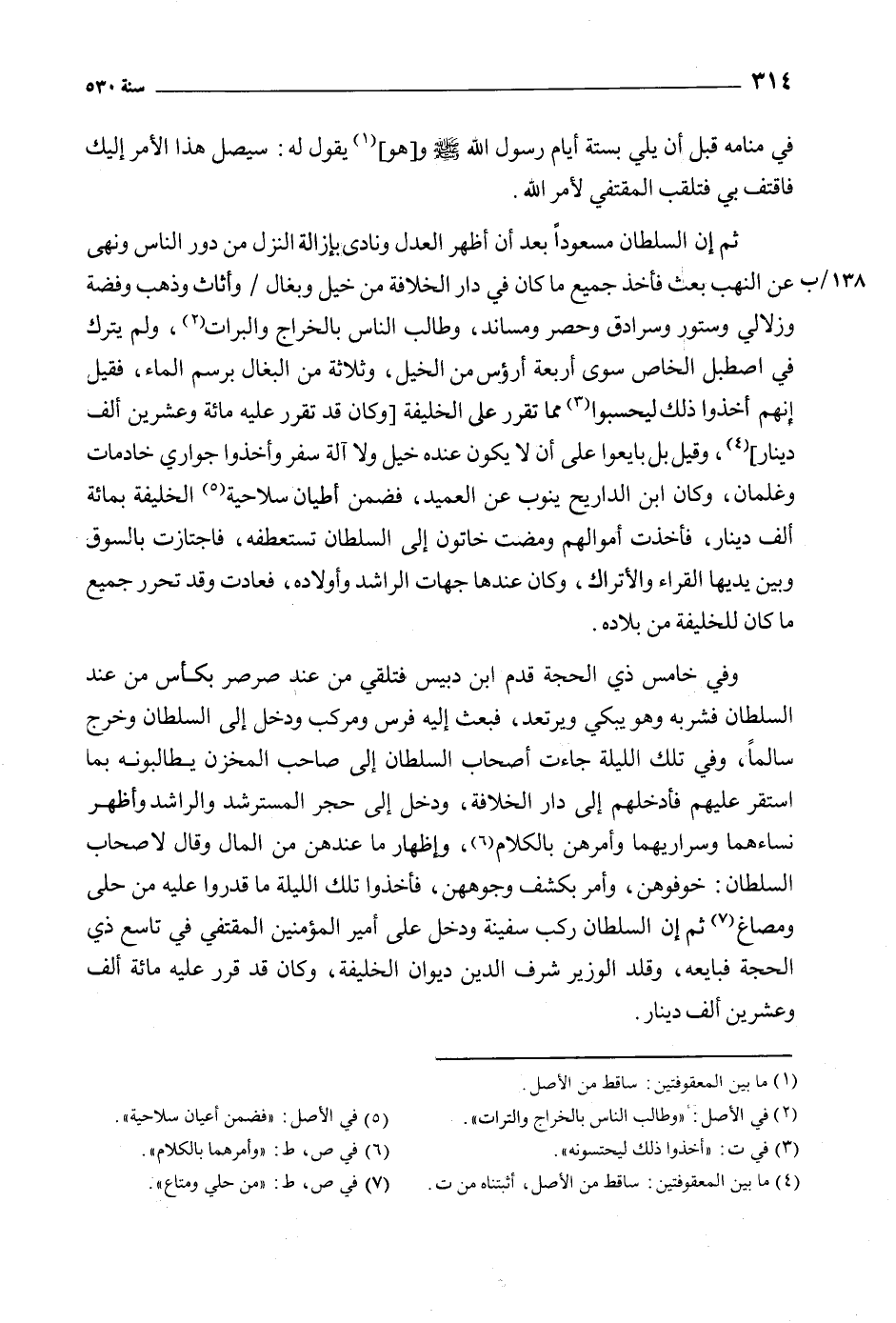 وفي خامس ذي الحجة قدم ابن دبيس فتلقى من عند صرصر بكاس من عند السلطان فشربه وهو يبكي ويرتعد، فبعث إليه فرس ومركب ودخل إلى السلطان وخرج سالما، وفي تلك الليلة جاءت أصحاب السلطان إلى صاحب المخزن يطالبونه بما استقر عليهم فأدخلهم إلى دار الخلافة، ودخل إلى حجر المسترشد والراشد وأظهر نساءهما وسراريهما وأمرهن بالكلام [6] ، وإظهار ما عندهن من المال وقال لأصحاب السلطان: خوفوهن، وأمر بكشف وجوههن، فأخذوا تلك الليلة ما قدروا عليه من حلي ومصاغ [7] ثم إن السلطان ركب سفينة ودخل على أمير المؤمنين المقتفي في تاسع ذي الحجة فبايعه، وقلد الوزير شرف الدين ديوان الخليفة، وكان قد قرر عليه مائة ألف وعشرين ألف دينار.