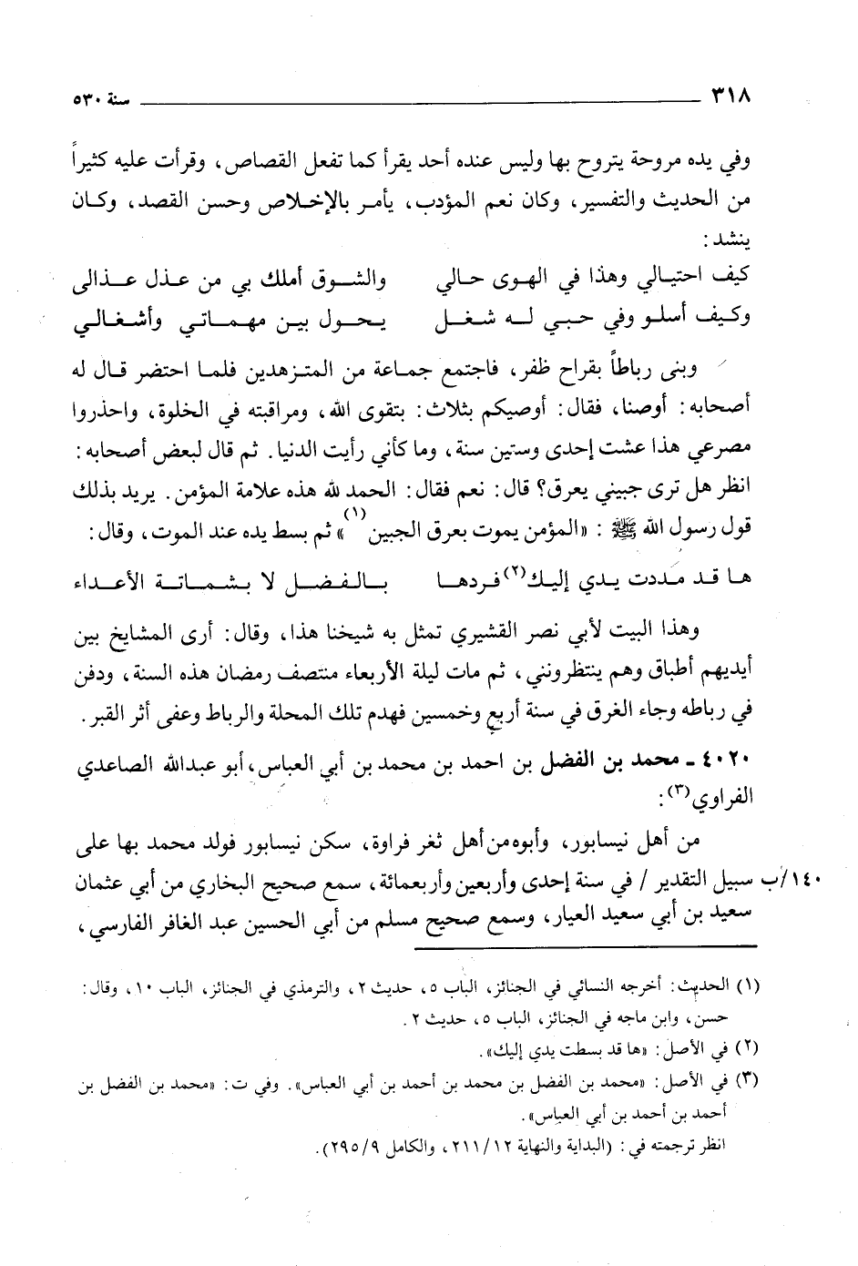 وهذا البيت لأبي نصر القشيري تمثل به شيخنا هذا، وقال: أرى المشايخ بين أيديهم أطباق وهم ينتظرونني، ثم مات ليلة الأربعاء منتصف رمضان هذه السنة، ودفن في رباطه وجاء الغرق في سنة أربع وخمسين فهدم تلك المحلة والرباط وعفي أثر القبر.