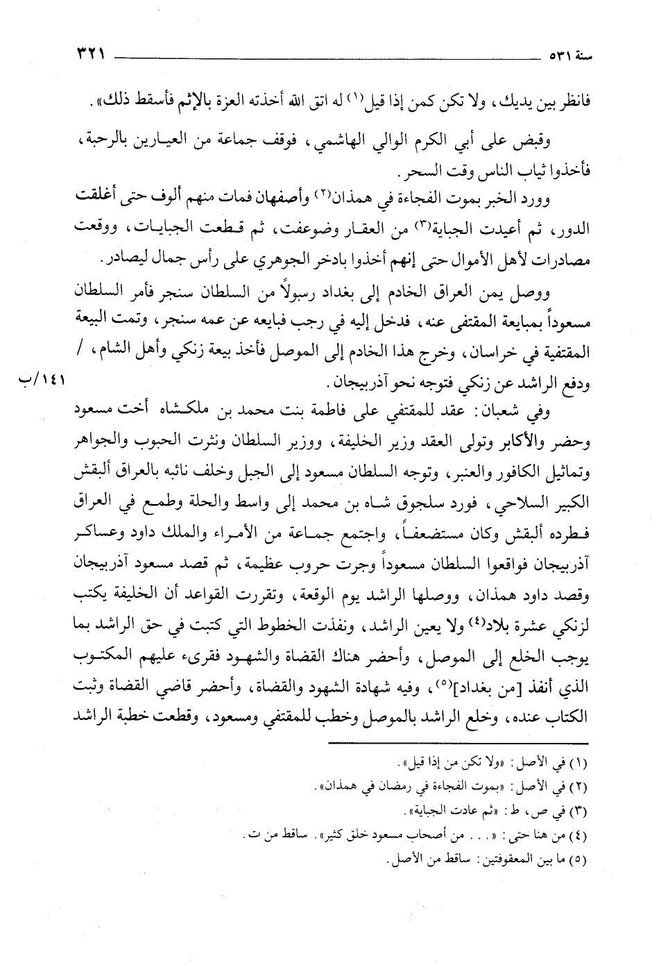 وفي شعبان: عقد للمقتفي على فاطمة بنت محمد بن ملك شاه أخت مسعود وحضر والأكابر وتولى العقد وزير الخليفة، ووزير السلطان ونثرت الحبوب والجواهر وتماثيل الكافور والعنبر، وتوجه السلطان مسعود إلى الجبل وخلف نائبه بالعراق ألبقش الكبير السلاحي، فورد سلجوق شاه بن محمد إلى واسط والحلة وطمع في العراق فطرده ألبقش وكان مستضعفا، واجتمع جماعة من الأمراء والملك داود وعساكر آذربيجان فواقعوا السلطان مسعودا وجرت حروب عظيمة، ثم قصد مسعود آذربيجان وقصد داود همذان، ووصلها الراشد يوم الوقعة، وتقررت القواعد ان الخليفة يكتب لزنكي عشرة بلاد [4] ولا يعين الراشد، ونفذت الخطوط التي كتبت في حق الراشد بما يوجب الخلع إلى الموصل، واحضر هناك القضاة والشهود فقرئ عليهم المكتوب الذي أنفذ [من بغداد] [5] ، وفيه شهادة الشهود والقضاة، وأحضر قاضي القضاة وثبت الكتاب عنده، وخلع الراشد بالموصل وخطب للمقتفي ومسعود، وقطعت خطبة الراشد
