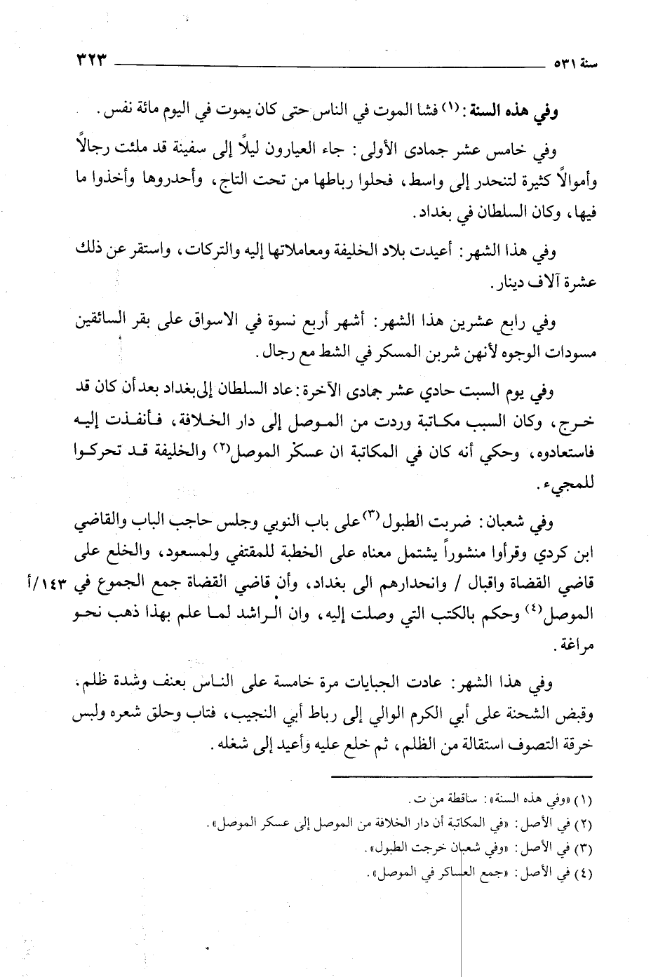 وفي يوم السبت حادي عشر جمادى الآخرة: عاد السلطان إلى بغداد بعد أن كان قد خرج، وكان السبب مكاتبة وردت من الموصل إلى دار الخلافة، فأنفذت إليه فاستعادوه، وحكى أنه كان في المكاتبة أن عسكر الموصل [2] والخليفة قد تحركوا للمجيء.