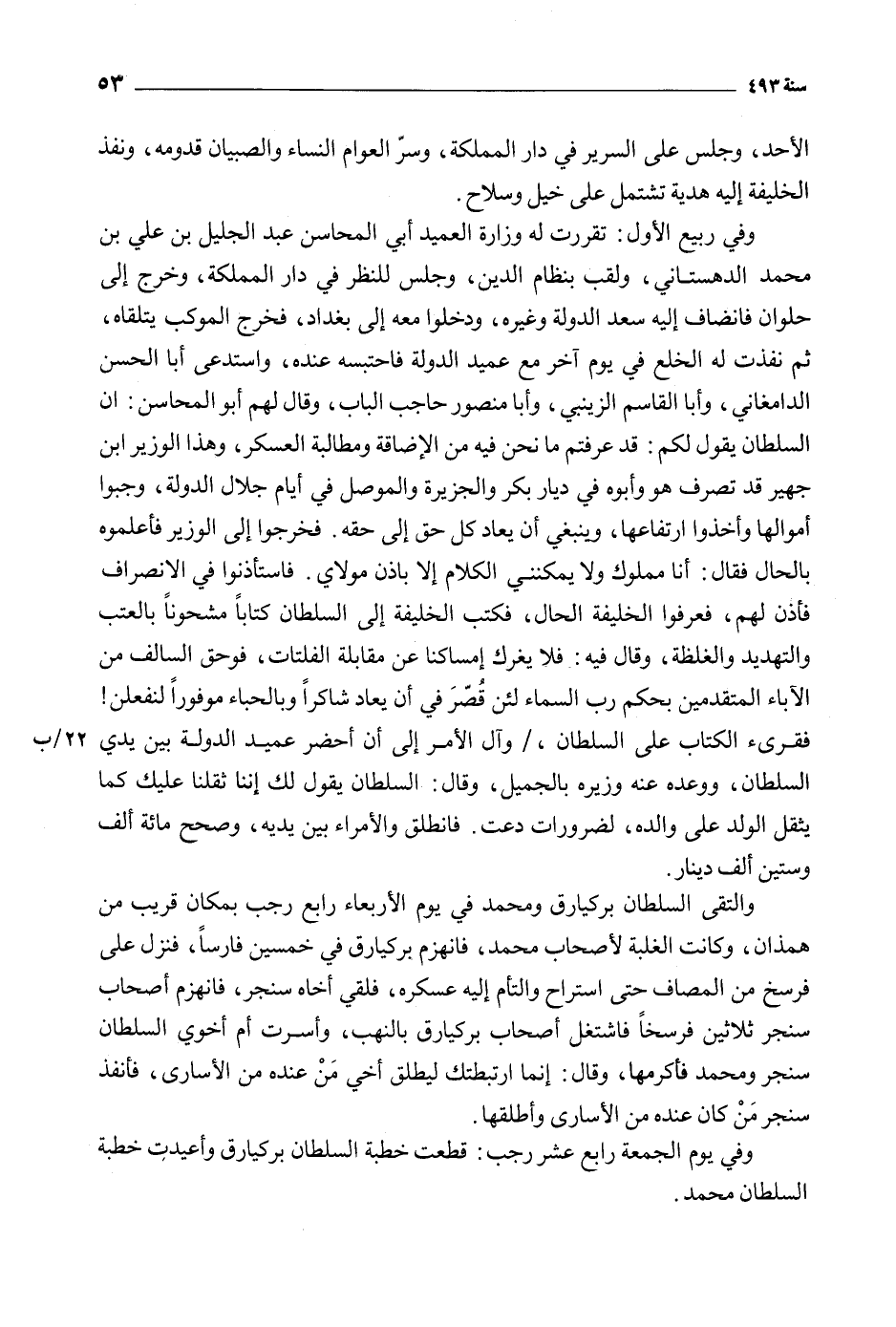 وفي ربيع الأول: تقررت له وزارة العميد أبي المحاسن عبد الجليل بن علي بن محمد الدهستاني، ولقب بنظام الدين، وجلس للنظر في دار المملكة، وخرج إلى حلوان فانضاف إليه سعد الدولة وغيره، ودخلوا معه إلى بغداد، فخرج الموكب يتلقاه، ثم نفذت له الخلع في يوم آخر مع عميد الدولة فاحتبسه عنده، واستدعى أبا الحسن الدامغاني، وأبا القاسم الزينبي، وأبا منصور حاجب الباب، وقال لهم أبو المحاسن: ان السلطان يقول لكم: قد عرفتم ما نحن فيه من الإضاقة ومطالبة العسكر، وهذا الوزير ابن جهير قد تصرف هو وأبوه في ديار بكر والجزيرة والموصل في أيام جلال الدولة، وجبوا أموالها وأخذوا ارتفاعها، وينبغي أن يعاد كل حق إلى حقه. فخرجوا إلى الوزير فاعلموه بالحال فقال: أنا مملوك ولا يمكنني الكلام إلا بإذن مولاي. فاستأذنوا في الانصراف فأذن لهم، فعرفوا الخليفة الحال، فكتب الخليفة إلى السلطان كتابا مشحونا بالعتب والتهديد والغلظه، وقال فيه: فلا يغرك إمساكنا عن مقابلة الفلتات، فو حقّ السالف من الآباء المتقدمين بحكم رب السماء لئن قصر في أن يعاد شاكرا وبالحباء موفورا لنفعلن! فقرئ الكتاب على السلطان، / وآل الأمر إلى أن أحضر عميد الدولة بين يدي 22/ ب السلطان، ووعده عنه وزيره بالجميل، وقال: السلطان يقول لك إننا ثقلنا عليك كما يثقل الولد على والده، لضرورات دعت. فانطلق والأمراء بين يديه، وصحح مائة ألف وستين ألف دينار.