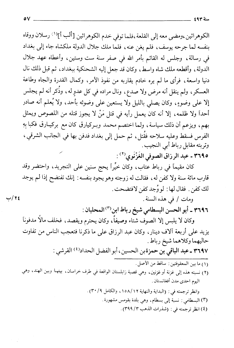 الكوهرائين، ومضى معه إلى القلعة، فلما توفي خدم الكوهرائين [ألب أ] [1] رسلان ووقاه بنفسه لما جرحه يوسف، فلم يغن عنه، فلما ملك جلال الدولة ملك شاه جاء إلى بغداد في رسالة، وجلس له القائم بأمر الله في صفر سنة ست وستين، وأعطاه عهد جلال الدولة، وأقطعه ملك شاة واسط، وكان قد جعل إليه الشحنكية ببغداد، ثم قبل ذلك نال دنيا واسعة، فرأى ما لم يره خادم يقاربه من نفوذ الأمر، وكمال القدرة والجاه وطاعة العسكر، ولم ينقل أنه مرض ولا صدع، ونال مراده في كل عدو له، وذكر أنه لم يجلس إلا على وضوء، وكان يصلي بالليل ولا يستعين على وضوئه بأحد، ولا يعلم أنه صادر أحدا ولا ظلمه، إلا أنه كان يعمل رأيه في قتل من لا يجوز قتله من اللصوص ويمثل بهم، ويزعم أن ذلك سياسة، ولما اختصم محمد وبركيارق كان مع بركيارق فكبا به الفرس فسقط وعليه سلاحه فقتل، ثم حمل إلى بغداد فدفن بها في الجانب الشرقي، وتربته مقابل رباط أبي النجيب.