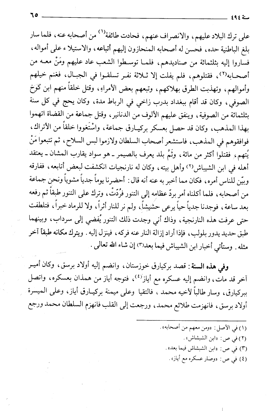على ترك البلاد عليهم، والانصراف عنهم، فحادت طائفة [1] من أصحابه عنه، فلما سار بلغ الباطنية حده، فحسن له أصحابه المنحازون إليهم أتباعه، والاستيلاء على أمواله، فساروا إليه بثلاثمائة من صناديدهم، فلما توسطوا الشعب عاد عليهم ومن معه من أصحابه [2] ، فقتلوهم، فلم يفلت إلا ثلاثة نفر تسلقوا في الجبال، فغنم خيلهم وأموالهم، وتهذبت الطرق بهلاكهم، وتبعهم بعض الأمراء، وقتل خلقا منهم ابن كوخ الصوفي، وكان قد أقام ببغداد بدرب زاخي في الرباط مدة، وكان يحج في كل سنة بثلاثمائة من الصوفية، وينفق عليهم الألوف من الدنانير، وقتل جماعة من القضاة اتهموا بهذا المذهب، وكان قد حصل بعسكر بركيارق جماعة، واستغووا خلقا من الأتراك، فوافقوهم في المذهب، فاستشعر أصحاب السلطان ولازموا لبس السلاح، ثم تتبعوا من يتهم، فقتلوا أكثر من مائة، وثم بلد يعرف بالصمير- هو سواد يقارب المشان- يعتقد أهله في ابن الشيباش [2] وأهل بيته، وكان له نارنجيات انكشفت لبعض أتابعه، ففارقه وبين للناس أمره، فكان مما أخبر به عنه أنه قال: أحضرنا يوما جديا مشويا ونحن جماعة من أصحابه، فلما أكلناه أمر برد عظامه إلى التنور فردت، وترك على التنور طبقا ثم رفعه بعد ساعة، فوجدنا جديا حيا يرعى حشيشا، ولم نر للنار أثرا، ولا للرماد خبرا، فتلطفت حتى عرفت هذه النارنجية، وذاك أنى وجدت ذلك التنور يفضى إلى سرداب، وبينهما طبق حديد يدور بلولب، فإذا أراد إزالة النار عنه فركه، فينزل إليه. ويترك مكانه طبقا آخر مثله. وستأتي أخبار ابن الشيباش فيما بعد [3] إن شاء الله تعالى.