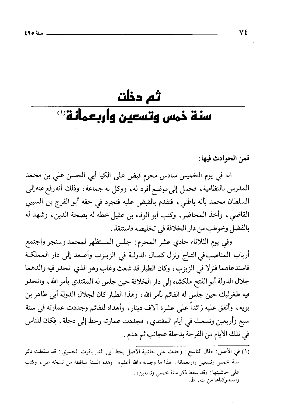 [1] في الأصل: «قال الناسخ: وجدت على حاشية الأصل بخط أبي الدر ياقوت الحموي: قد سقطت ذكر سنة خمس وتسعين واربعمائة. هذا ما وجدته والله أعلم» . وهذه السنة ساقطة من نسخة ص، وكتب على حاشيتها: «قد سقط ذكر سنة خمس وتسعين» .