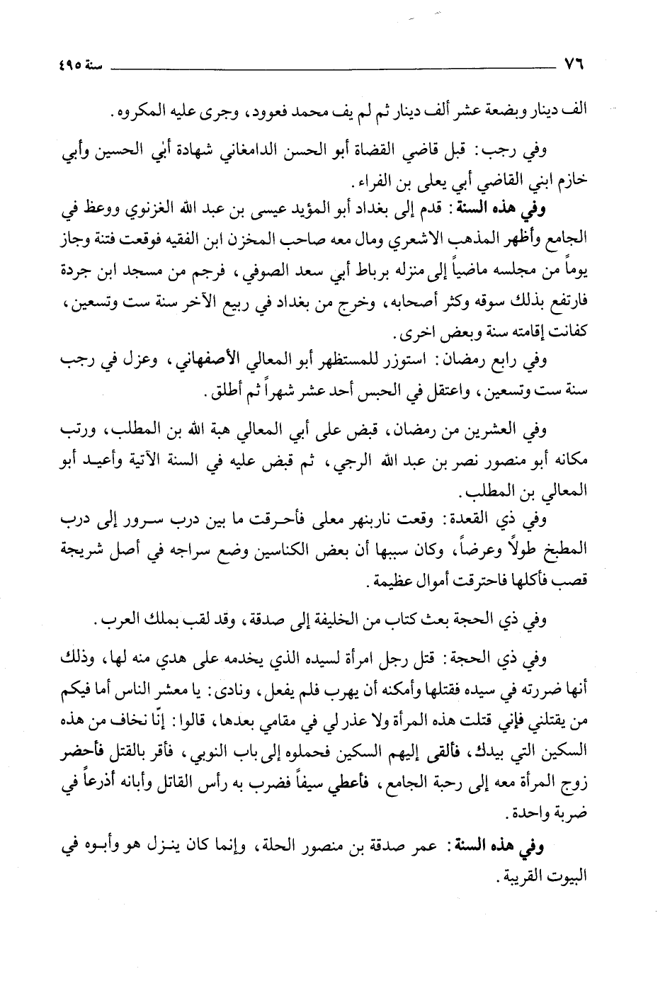 وفي ذي الحجة: قتل رجل امرأة لسيدة الذي يخدمه على هدى منه لها، وذلك أنها ضررته في سيده فقتلها وأمكنه أن يهرب فلم يفعل، ونادى: يا معشر الناس أما فيكم من يقتلني فإني قتلت هذه المرأة ولا عذر لي في مقامي بعدها، قالوا: أنا نخاف من هذه السكين التي بيدك، فألقى إليهم السكين فحملوه إلى باب النوبي، فأقر بالقتل فاحضر زوج المرأة معه إلى رحبة الجامع، فأعطى سيفا فضرب به رأس القاتل وأبانه أذرعا في ضربة واحدة.