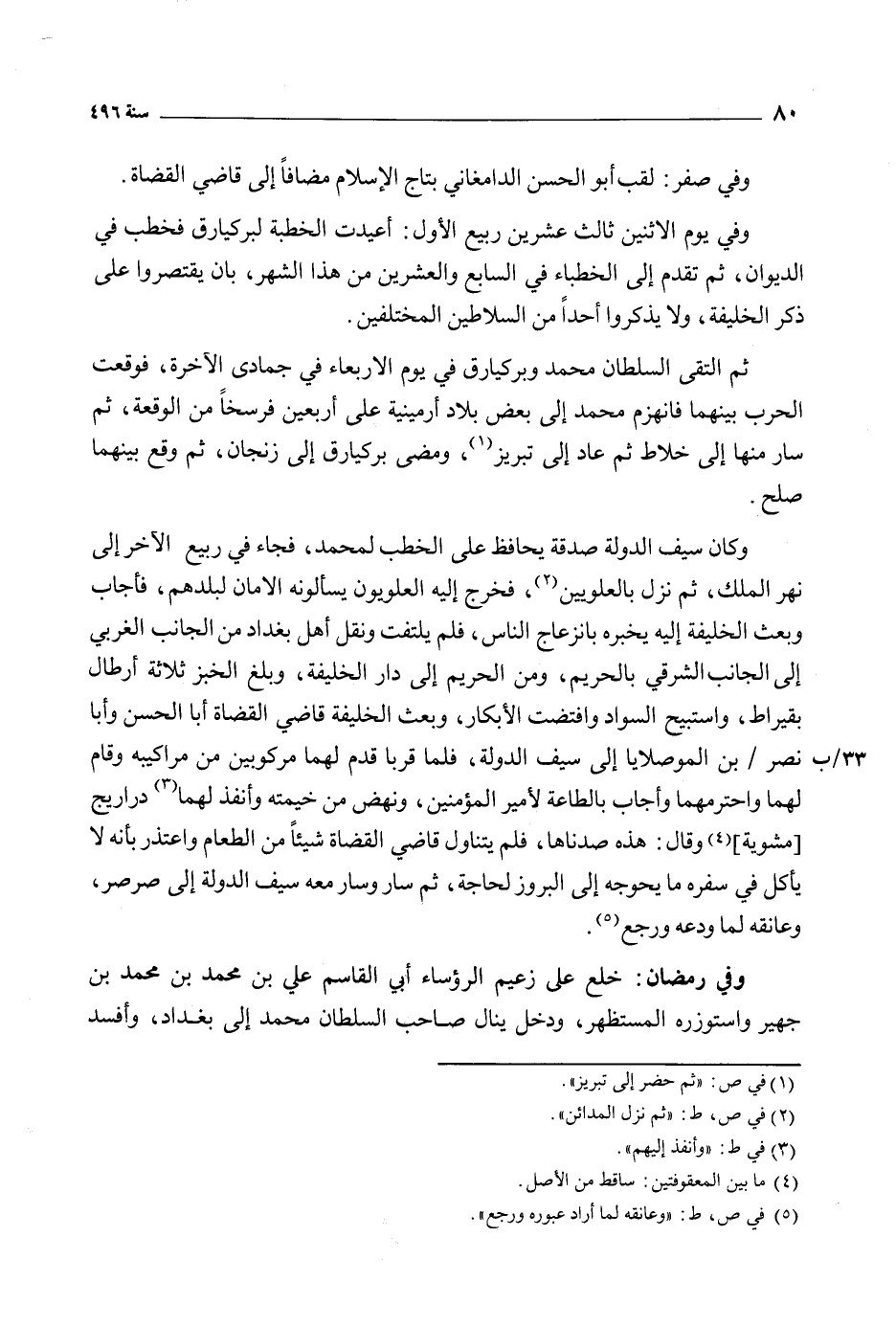 وفي يوم الاثنين ثالث عشرين ربيع الأول: أعيدت الخطبة لبركيارق فخطب في الديوان، ثم تقدم إلى الخطباء في السابع والعشرين من هذا الشهر، بأن يقتصروا على ذكر الخليفة، ولا يذكروا احدا من السلاطين المختلفين.