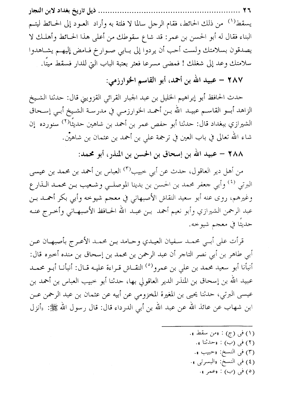 حدث الحافظ أَبُو إِبْرَاهِيم الخليل بن عبد الجبار القرائي القزويني قال: حدثنا الشيخ الزاهد أَبُو الْقَاسِمِ عُبَيْد اللَّه بْن أَحْمَد الخوارزمي فِي مدرسة الشيخ أَبِي إسحاق الشيرازي ببغداد قَالَ: حَدَّثَنَا أَبُو حَفْصٍ عُمَرُ بْنُ أَحْمَدَ بن شاهين حديثا [2] سنورده إن شاء اللَّه تعالى فِي باب العين فِي ترجمة عَلِيّ بْن أَحْمَد بْن عثمان بْن شاهين.