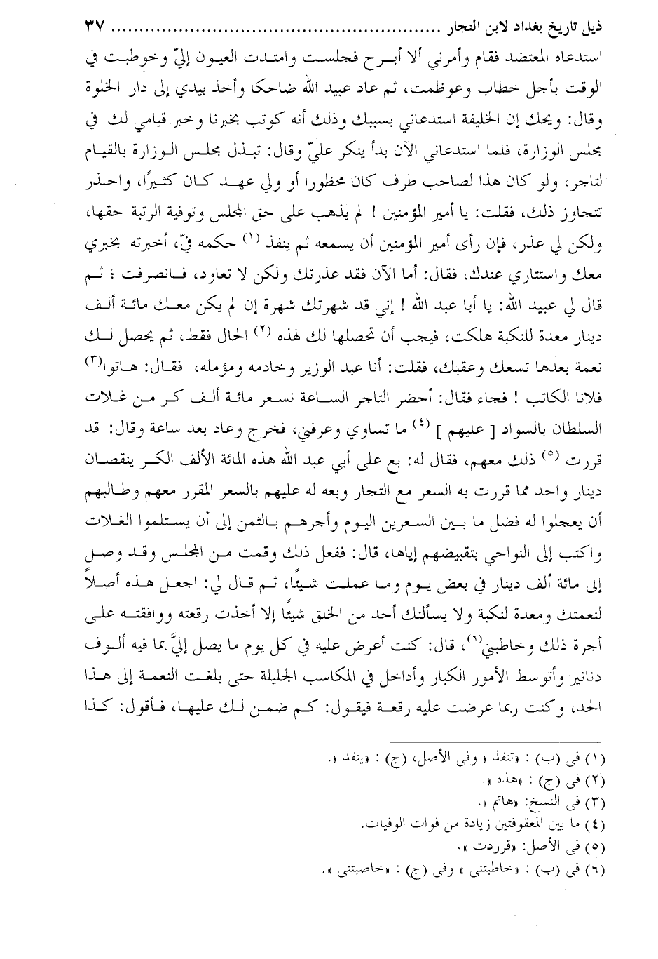 استدعاه المعتضد فقام وأمرني ألا أبرح فجلست وامتدت العيون إلي وخوطبت فِي الوقت بأجل خطاب وعوظمت، ثم عاد عُبَيْد اللَّه ضاحكا وأخذ بيدي إلى دار الخلوة وَقَالَ: ويحك إن الخليفة استدعاني بسببك وذلك أنه كوتب بخبرنا وخبر قيامي لك فِي مجلس الوزارة، فلما استدعاني الآن بدأ ينكر عَلِيّ وَقَالَ: تبذل مجلس الوزارة بالقيام لتاجر، ولو كان هَذَا لصاحب طرف كان محظورا أو ولي عهد كان كثيرا، واحذر تتجاوز ذلك، فقلت: يا أمير المؤمنين! لم يذهب عَلَى حق المجلس وتوفية الرتبة حقها، ولكن لي عذر، فإن رأى أمير المؤمنين أن يسمعه ثم ينفذ [1] حكمه فيّ، أخبرته بخبري معك واستتاري عندك، فَقَالَ: أما الآن فقد عذرتك ولكن لا تعاود، فانصرفت؛ ثم قَالَ لي عُبَيْد اللَّه: يا أَبَا عَبْد اللَّه! إني قد شهرتك شهرة إن لم يكن معك مائة ألف دينار معدة للنكبة هلكت، فيجب أن تحصلها لك لهذه [2] الحال فقط، ثم يحصل لك نعمة بعدها تسعك وعقبك، فقلت: أنا عَبْد الوزير وخادمه ومؤمله، فَقَالَ: هاتوا [3] فلانا الكاتب! فجاء فقال: أحضر التاجر الساعة نسعر مائة ألف كر من غلات السلطان بالسواد [عليهم] [4] ما تساوي وعرفني، فخرج وعاد بعد ساعة وَقَالَ: قد قررت [5] ذلك معهم، فَقَالَ له: بع عَلَى أَبِي عَبْد اللَّه هذه المائة الألف الكر ينقصان دينار واحد مما قررت به السعر مع التجار وبعه له عليهم بالسعر المقرر معهم وطالبهم أن يعجلوا له فضل ما بين السعرين اليوم وأجرهم بالثمن إلى أن يستلموا الغلات وأكتب إلى النواحي بتقبيضهم إياها، قَالَ: ففعل ذلك وقمت من المجلس وقد وصل إليّ مائة ألف دينار فِي بعض يوم وما عملت شيئا، ثم قَالَ لي: اجعل هذه أصلًا لنعمتك ومعدة لنكبة ولا يسألنك أحد من الخلق شيئا إلا أخذت رقعته ووافقته عَلَى أجرة ذلك وخاطبني [6] ، قَالَ: كنت أعرض عليه فِي كل يوم ما يصل إليّ بما فيه ألوف دنانير وأتوسط الأمور الكبار وأداخل فِي المكاسب الجليلة حتى بلغت النعمة إلى هَذَا الحد، وكنت ربما عرضت عليه رقعة فيقول: كم ضمن لك عليها، فأقول: كذا