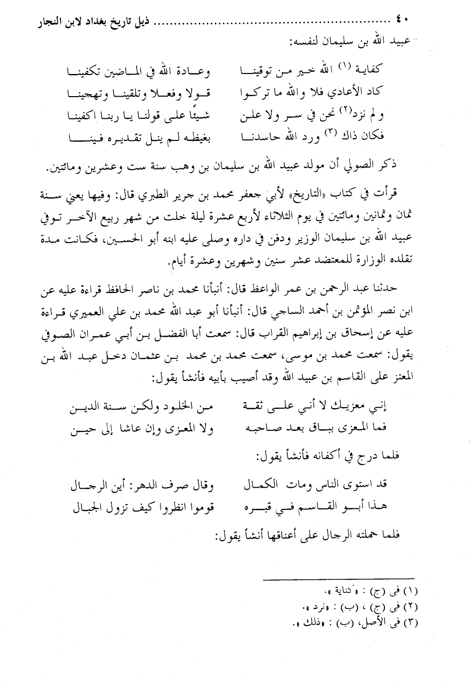 حدثنا عَبْد الرحمن بن عمر الواعظ قال: أنبأنا محمد بن ناصر الحافظ قراءة عليه عن ابن نصر المؤتمن بن أحمد الساجي قال: أنبأنا أبو عبد الله محمد بن عَلِيّ العميري قراءة عليه عن إسحاق بْن إِبْرَاهِيم القراب قَالَ: سَمِعْت أَبَا الفضل بْن أَبِي عمران الصوفي يَقُول: سَمِعْت مُحَمَّد بْن موسى، سَمِعْت مُحَمَّد بْن مُحَمَّد بْن عثمان دخل عَبْد اللَّه بْن المعتز عَلَى القَاسِم بْن عُبَيْد اللَّه وقد أصيب بأبيه فأنشأ يَقُول: