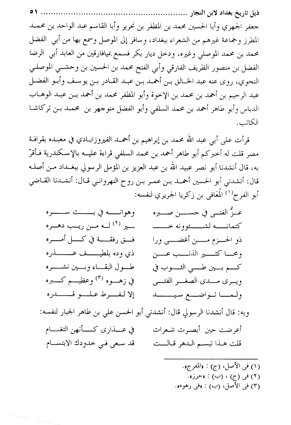 قَرَأْتُ عَلَى أَبِي عَبْدِ اللَّهِ مُحَمَّدِ بْنِ إِبْرَاهِيم بْن أَحْمَد الفيروزآبادي فِي معبده بقرافة مصر قلت له أخبر كم أبو طاهر أحمد بن محمد السلفي قراءة عليه بالإسكندرية فأقر به، قَالَ أنشدنا أَبُو نصر عُبَيْد اللَّه بْن عَبْد العزيز بْن المؤمل الرسولي ببغداد من أصله قَالَ: أنشدني أَبُو الْحُسَيْن أَحْمَد بْن عمر بْن روح النهرواني قَالَ: أنشدنا الْقَاضِي أَبُو الْفَرَجِ [1] الْمُعَافَى بْنُ زَكَرِيَّا الْجَرِيرِيُّ لنفسه: