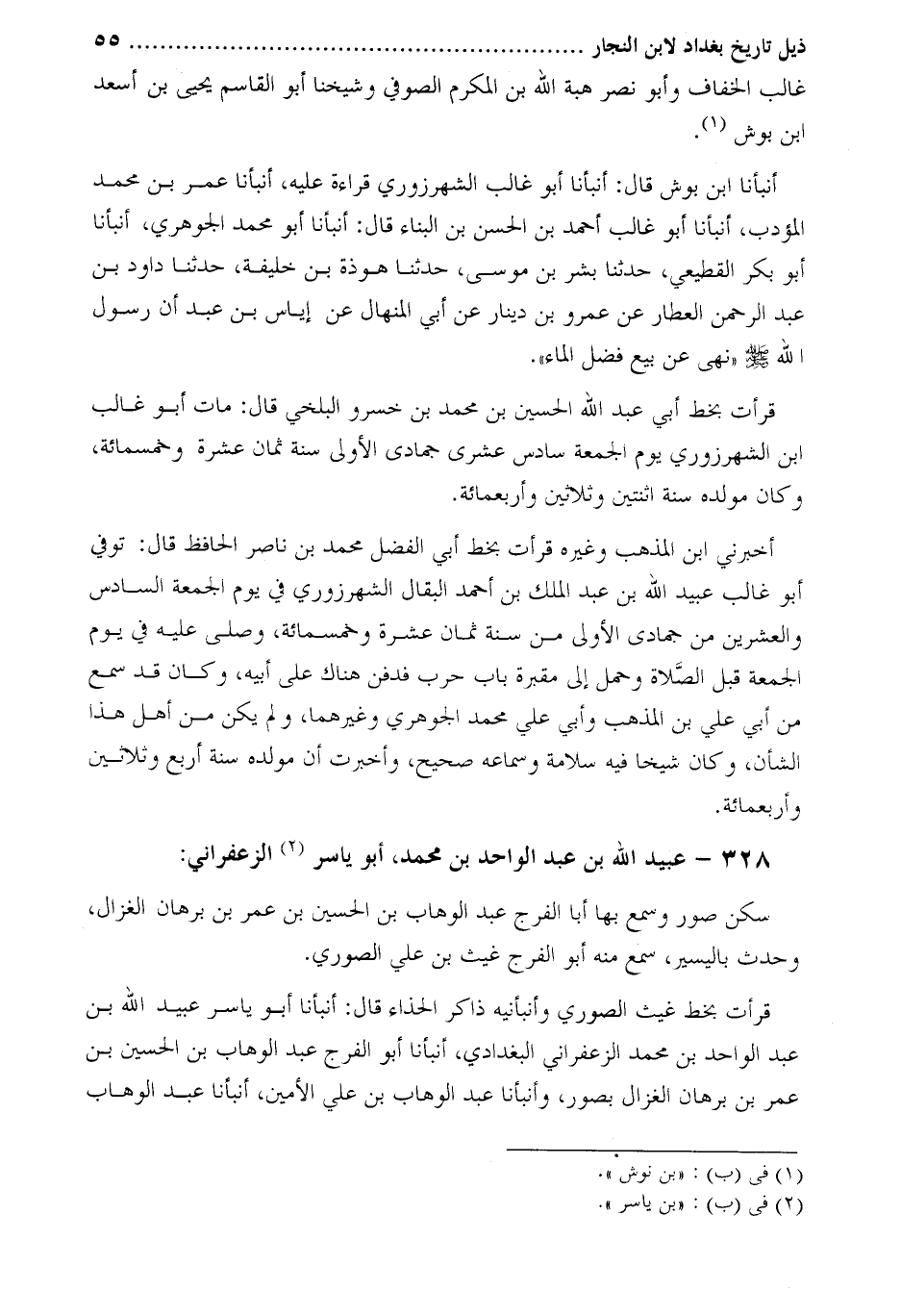 قَرَأْتُ بِخَطِّ غَيْثٍ الصُّورِيِّ وَأَنْبَأَنِيهِ ذَاكِرٌ الْحَذَّاءُ قال: أنبأنا أَبُو يَاسِرٍ عُبَيْدُ اللَّهِ بْنُ عَبْدِ الْوَاحِدِ بن محمد الزعفراني البغدادي، أنبأنا أَبُو الْفَرَجِ عَبْد الْوَهَّابِ بْن الْحُسَيْنِ بْن عُمَرَ بْنِ برهان الغزال بصور، وأنبأنا عبد الوهاب بن علي الأمين، أنبأنا عبد الوهاب