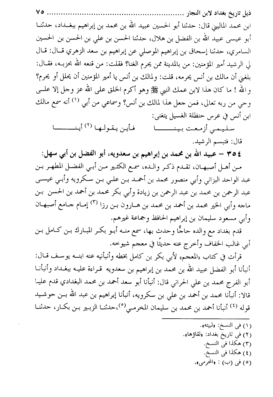 أَنْبَأَنَا أَبُو الْفَضْلِ عُبَيْدُ اللَّهِ بْنُ مُحَمَّدِ بْنِ إبراهيم بن سعدويه قراءة عليه ببغداد وأنبأنا أَبُو الْفَرَجِ مُحَمَّدُ بْنُ عَلِيٍّ الْحَرَّانِيُّ قَالَ: أنبأنا أَبُو سَعْدٍ أَحْمَدُ بْنُ مُحَمَّدٍ الْبَغْدَادِيُّ قَدِمَ علينا قالا: أنبأنا محمد بن أحمد بن علي بن سكرويه، أنبأنا إبراهيم بن عبد الله بن حوشيد قوله [4] أنبأنا أحمد بن محمد بن سليمان المخرمي [5] ، حدثنا الزبير بن بكار، حدثنا