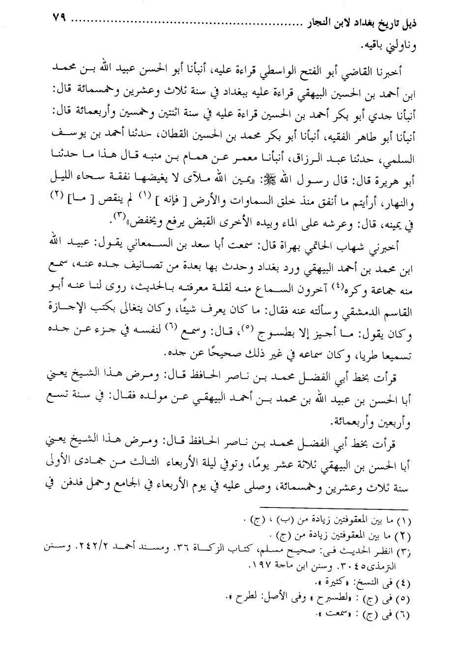 أنبأنا أبو طاهر الفقيه، أنبأنا أبو بكر محمد بن الحسين القطان، حدثنا أحمد بن يوسف السلمي، حدثنا عبد الرزاق، أنبأنا مَعْمَرٌ عَنْ هَمَّامِ بْنِ مُنَبِّهٍ قَالَ هَذَا مَا حَدَّثَنَا أَبُو هُرَيْرَةَ قَالَ: قَالَ رَسُولُ اللَّهِ صَلَّى اللَّهُ عَلَيْهِ وَسَلَّمَ: «يَمِينُ اللَّهِ مَلأَى لا يَغِيضُهَا نَفَقَةٌ سَحَّاءُ اللَّيْلَ وَالنَّهَارَ، أرأيتم ما أنفق منذ خلق السماوات وَالأَرْضَ [فَإِنَّهُ] [1] لَمْ يَنْقُصْ [مَا] [2]