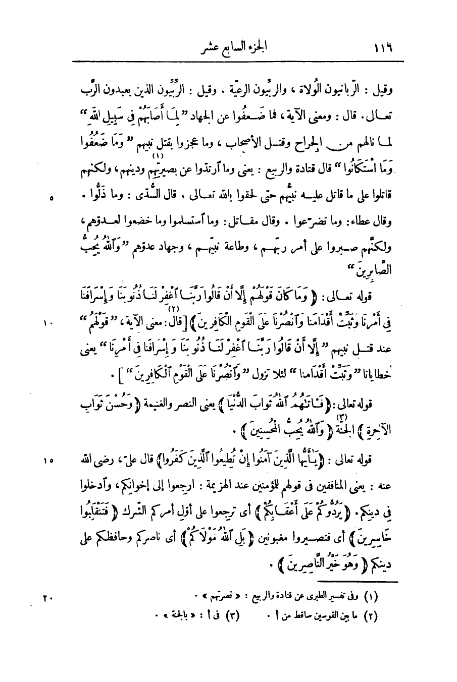 وقيل: الرّبانيون الولاة، والربّيون الرعيّة. وقيل: الرّبيّون الذين يعبدون الرّب تعالى. قال: ومعنى الآية، فما ضعفوا عن الجهاد «لما أصابهم فى سبيل الله» لما نالهم من الجراح وقتل الأصحاب، وما عجزوا بقتل نبيهم «وما ضعفوا وما استكانوا» قال قتادة والربيع: يعنى وما ارتدوا عن بصيرتهم»