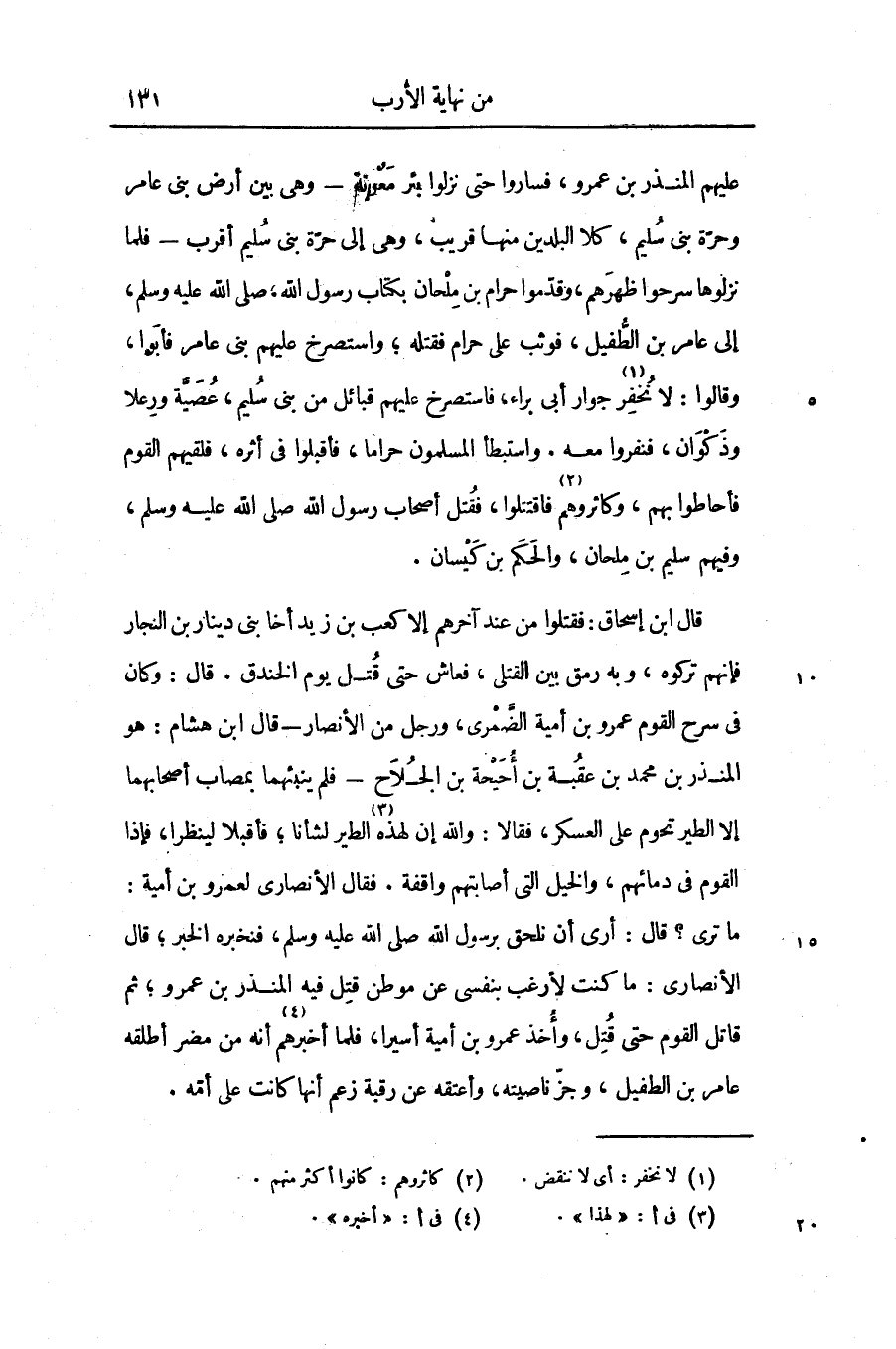 ما ترى؟ قال: أرى أن نلحق برسول الله صلّى الله عليه وسلّم، فنخبره الخبر؛ قال الأنصارى: ما كنت لأرغب بنفسى عن موطن قتل فيه المنذر بن عمرو؛ ثم قاتل القوم حتى قتل، وأخذ عمرو بن أمية أسيرا، فلما أخبرهم «4» أنه من مضر أطلقه عامر بن الطفيل، وجزّ ناصيته، وأعتقه عن رقبة زعم أنها كانت على أمّه.
