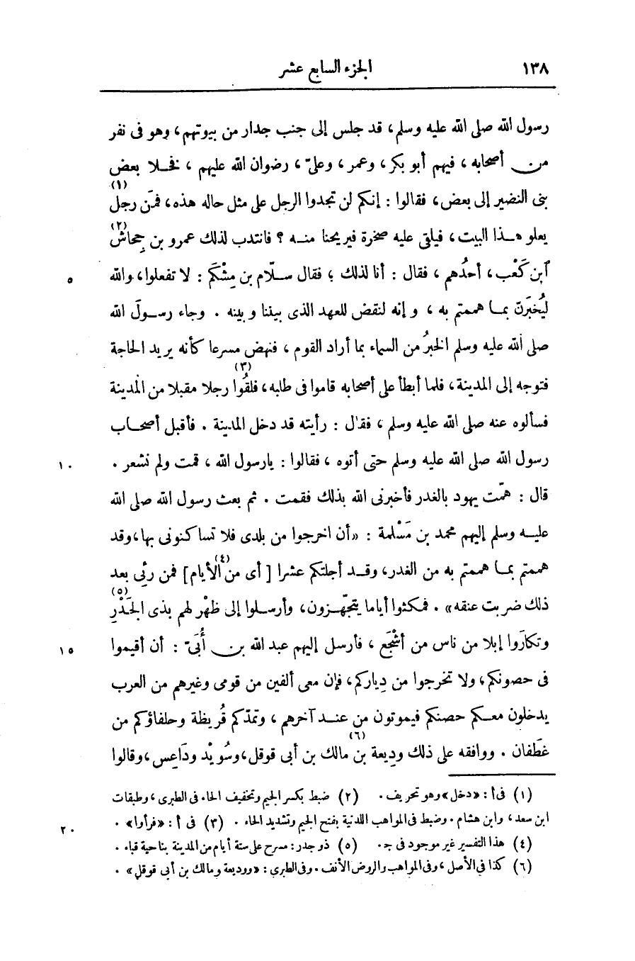 رسول الله صلّى الله عليه وسلّم، قد جلس إلى جنب جدار من بيوتهم، وهو فى نفر من أصحابه، فيهم أبو بكر، وعمر، وعلىّ، رضوان الله عليهم، فخلا بعض بنى النضير إلى بعض، فقالوا: إنكم لن تجدوا الرجل على مثل حاله هذه، فمن رجل «1» يعلو هذا البيت، فيلقى عليه صخرة فيريحنا منه؟ فانتدب لذلك عمرو بن جحاش «2» ابن كعب، أحدهم، فقال: أنا لذلك؛ فقال سلّام بن مشكم: لا تفعلوا، والله ليخبرنّ بما هممتم به، وإنه لنقض للعهد الذى بيننا وبينه. وجاء رسول الله صلّى الله عليه وسلّم الخبر من السماء بما أراد القوم، فنهض مسرعا كأنه يريد الحاجة فتوجه إلى المدينة، فلما أبطأ على أصحابه قاموا فى طلبه، فلقوا «3» رجلا مقبلا من المدينة فسألوه عنه صلّى الله عليه وسلّم، فقال: رأيته قد دخل المدينة. فأقبل أصحاب رسول الله صلّى الله عليه وسلّم حتى أتوه، فقالوا: يا رسول الله، قمت ولم نشعر.
