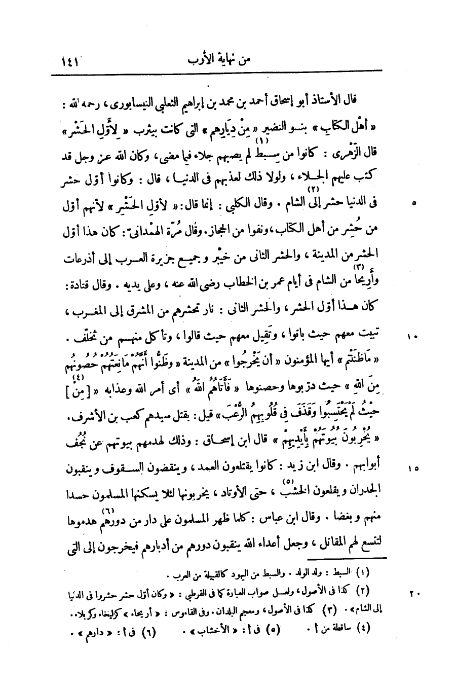 «أهل الكتاب» بنو النضير «من ديارهم» التى كانت بيثرب «لأوّل الحشر» قال الزهرى: كانوا من سبط «1» لم يصبهم جلاء فيما مضى، وكان الله عز وجل قد كتب عليهم الجلاء، ولولا ذلك لعذبهم فى الدنيا، قال: وكانوا أوّل حشر فى الدنيا حشر إلى «2» الشام. وقال الكلبى: إنما قال: «لأوّل الحشر» لأنهم أوّل حشر من أهل الكتاب، ونفوا من الحجاز. وقال مرّة الهمدانىّ: كان هذا أوّل الحشر من أهل المدينة، والحشر الثانى من خيبر وجميع جزيرة العرب إلى أذرعات وأريحا «3» من الشام فى أيام عمر بن الخطاب رضى الله عنه، وعلى يديه. وقال قتادة: