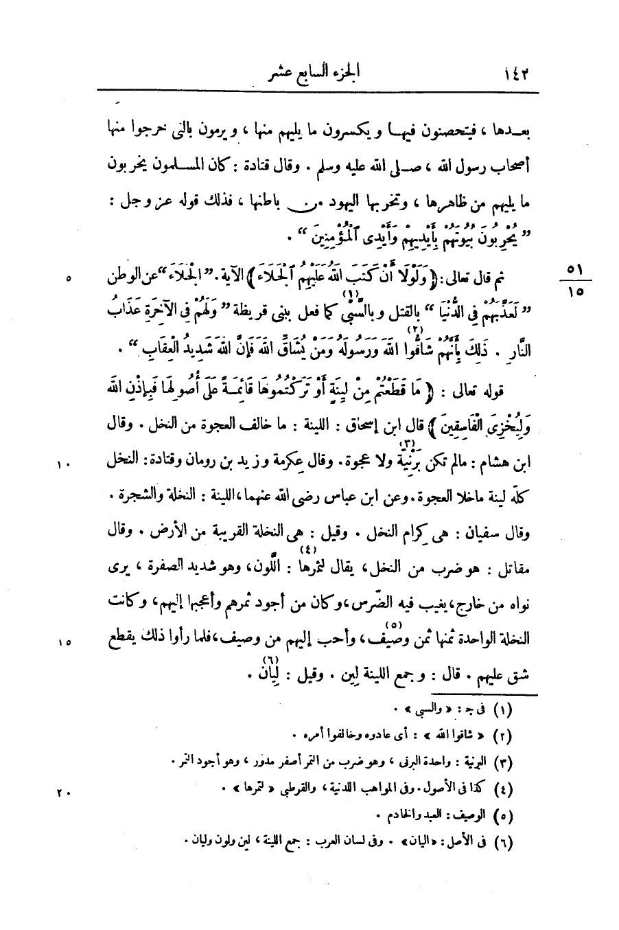 قال ابن إسحاق: اللينة: ما خالف العجوة من النخل. وقال ابن هشام: ما لم تكن برنيّة «3» ولا عجوة. وقال عكرمة وزيد بن رومان وقتادة: النخل كلّه لينة ما خلا العجوة. وعن ابن عباس رضى الله عنهما، اللينة: النخلة والشجرة.