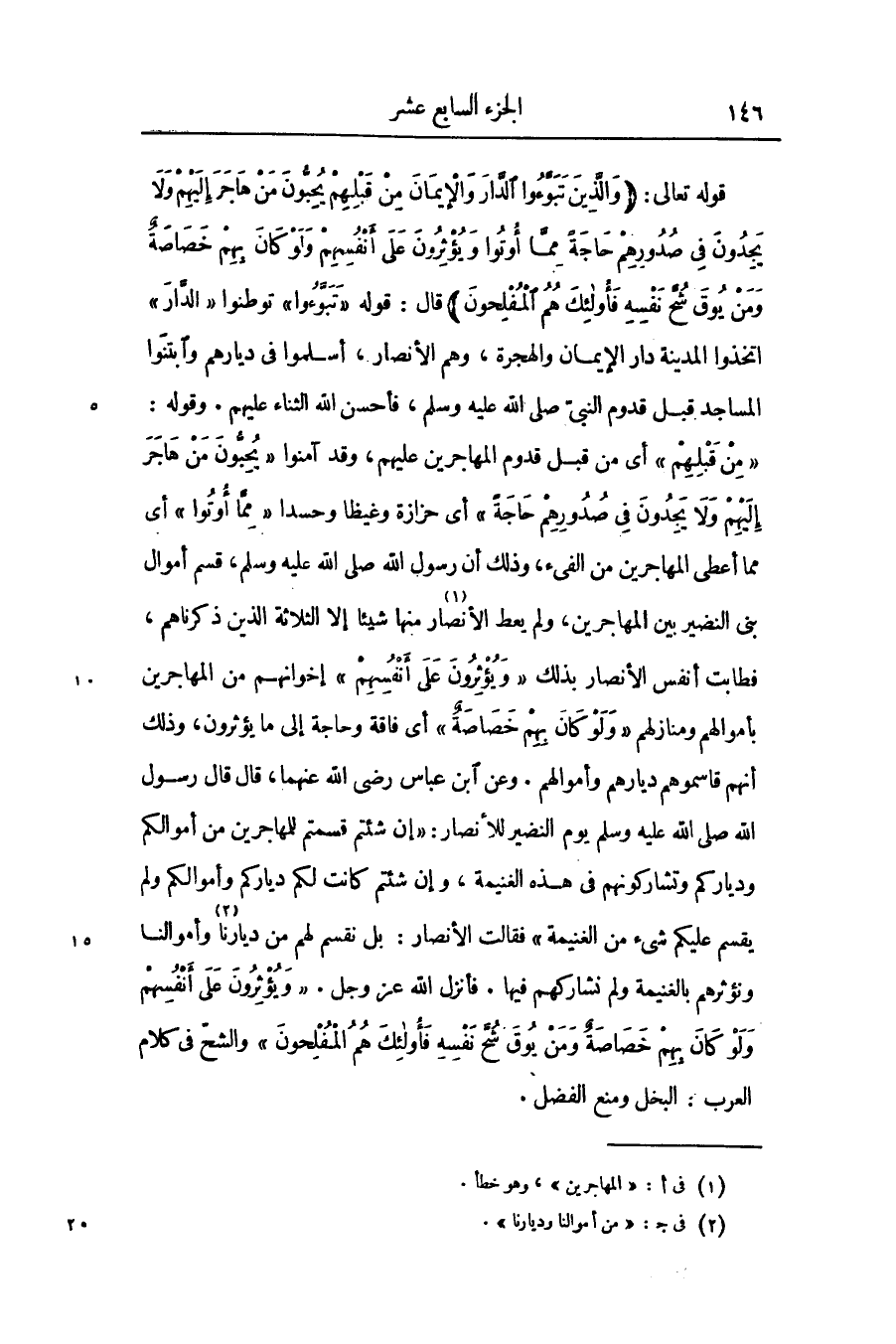 قوله تعالى: (وَالَّذِينَ تَبَوَّؤُا الدَّارَ وَالْإِيمانَ مِنْ قَبْلِهِمْ يُحِبُّونَ مَنْ هاجَرَ إِلَيْهِمْ وَلا يَجِدُونَ فِي صُدُورِهِمْ حاجَةً مِمَّا أُوتُوا وَيُؤْثِرُونَ عَلى أَنْفُسِهِمْ وَلَوْ كانَ بِهِمْ خَصاصَةٌ وَمَنْ يُوقَ شُحَّ نَفْسِهِ فَأُولئِكَ هُمُ الْمُفْلِحُونَ)