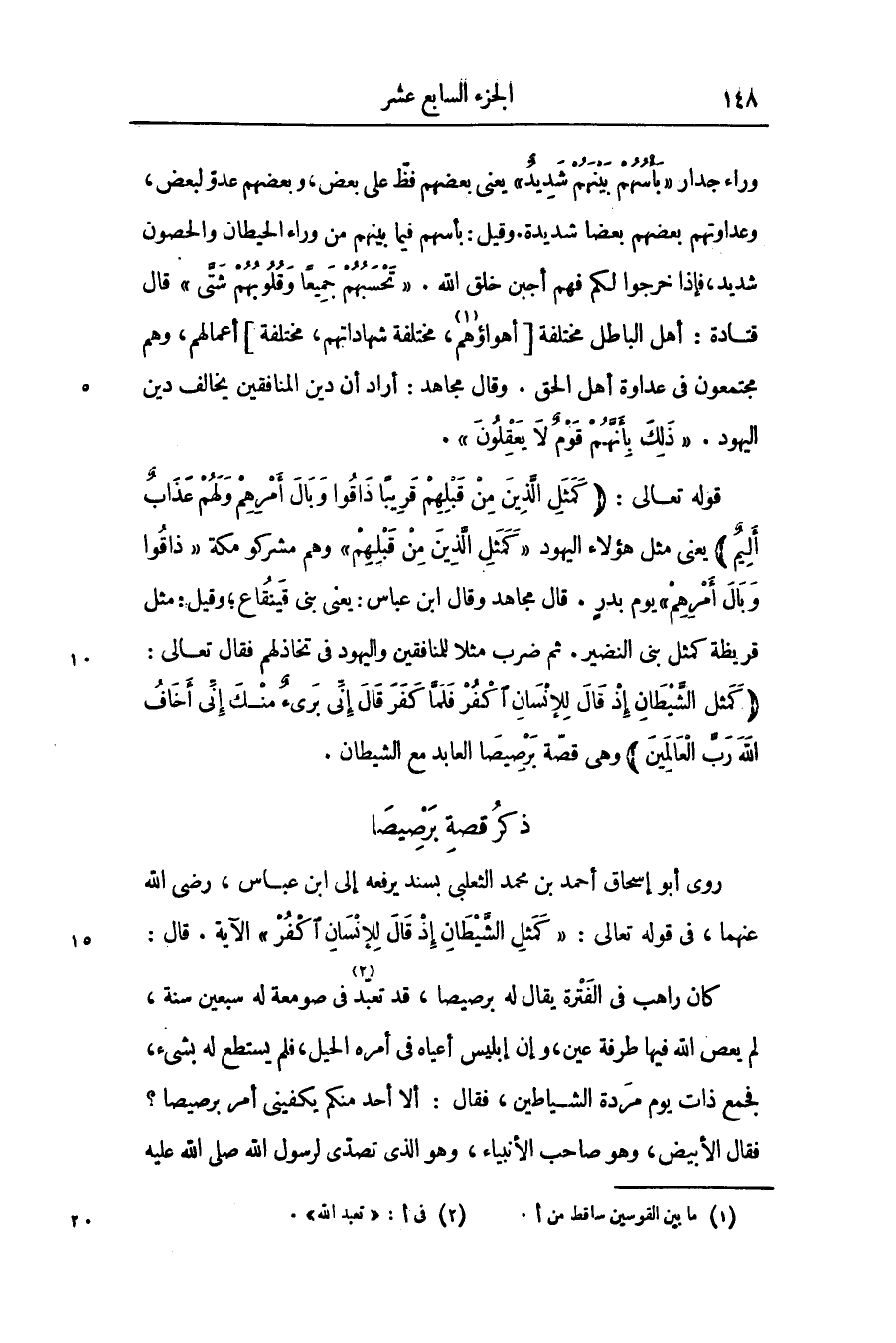 روى أبو إسحاق أحمد بن محمد الثعلبى بسند يرفعه إلى ابن عباس، رضى الله عنهما، فى قوله تعالى: (كَمَثَلِ الشَّيْطانِ إِذْ قالَ لِلْإِنْسانِ اكْفُرْ)