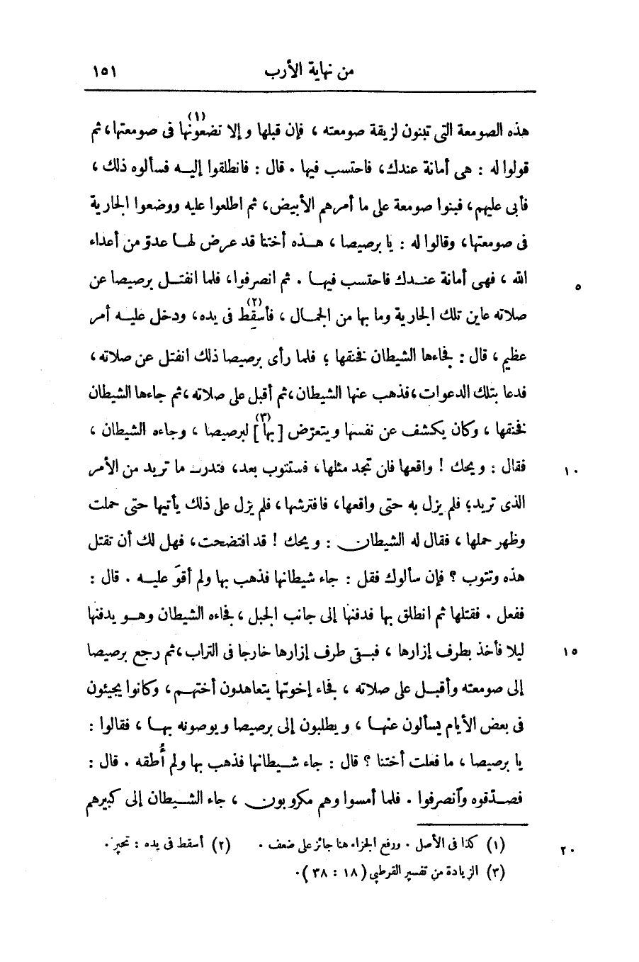 هذه الصومعة التى تبنون لزيقة صومعته، فإن قبلها وإلا تضعونها «1» في صومعتها، ثم قولوا له: هى أمانة عندك، فاحتسب فيها. قال: فانطلقوا إليه فسألوه ذلك، فأبى عليهم، فبنوا صومعة على ما أمرهم الأبيض، ثم اطلعوا عليه ووضعوا الجارية فى صومعتها، وقالوا له: يا برصيصا، هذه أختنا قد عرض لها عدوّ من أعداء الله، فهى أمانة عندك فاحتسب فيها. ثم انصرفوا، فلما انفتل برصيصا عن صلاته عاين تلك الجارية وما بها من الجمال، فأسقط «2» في يده، ودخل عليه أمر عظيم، قال: فجاءها الشيطان فخنقها؛ فلما رأى برصيصا ذلك انفتل عن صلاته، فدعا بتلك الدعوات، فذهب عنها الشيطان، ثم أقبل على صلاته، ثم جاءها الشيطان فخنقها، وكان يكشف عن نفسها ويتعرّض [بها «3» ] لبرصيصا، وجاءه الشيطان، فقال: ويحك! واقعها فلن تجد مثلها، فستتوب بعد، فتدرك ما تريد من الأمر الذى تريد؛ فلم يزل به حتى واقعها، فافترشها، فلم يزل على ذلك يأتيها حتى حملت وظهر حملها، فقال له الشيطان: ويحك! قد افتضحت، فهل لك أن تقتل هذه وتتوب؟ فإن سألوك فقل: جاء شيطانها فذهب بها ولم أقو عليه. قال:
