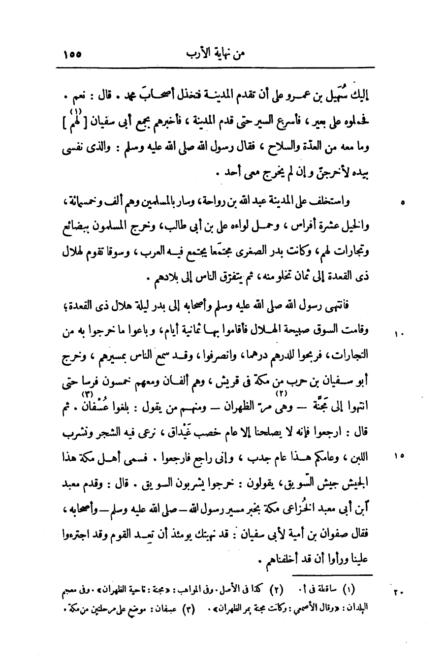 فانتهى رسول الله صلّى الله عليه وسلّم وأصحابه إلى بدر ليلة هلال ذى القعدة؛ وقامت السوق صبيحة الهلال فأقاموا بها ثمانية أيام، وباعوا ما خرجوا به من التجارات، فربحوا للدرهم درهما، وانصرفوا، وقد سمع الناس بمسيرهم، وخرج أبو سفيان بن حرب من مكة فى قريش، وهم ألفان ومعهم خمسون فرسا حتى انتهوا إلى مجنّة- وهى «2» مرّ الظهران- ومنهم من يقول: بلغوا عسفان «3» . ثم قال: ارجعوا فإنه لا يصلحنا إلا عام خصب غيداق، نرعى فيه الشجر ونشرب اللبن، وعامكم هذا عام جدب، وإنى راجع فارجعوا. فسمى أهل مكة هذا الجيش جيش السّويق، يقولون: خرجوا يشربون السويق. قال: وقدم معبد ابن أبى معبد الخزاعى مكة بخبر مسير رسول الله- صلّى الله عليه وسلّم- وأصحابه، فقال صفوان بن أمية لأبى سفيان: قد نهيتك يومئذ أن تعد القوم وقد اجترءوا علينا ورأوا أن قد أخلفناهم.