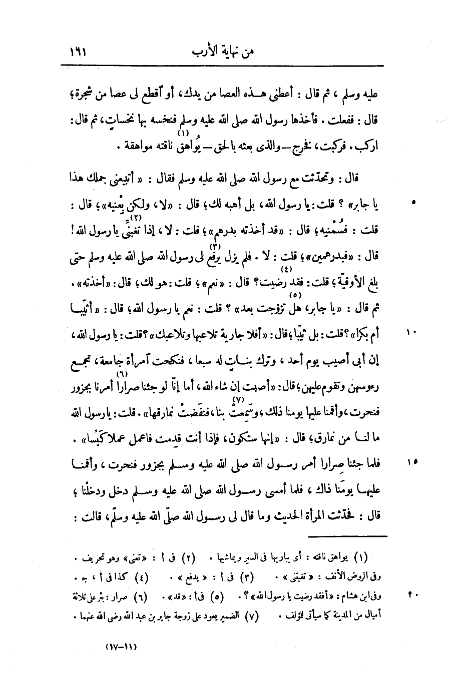 ثم قال: «يا جابر، هل «5» تزوجت بعد» ؟ قلت: نعم يا رسول الله؛ قال: «أثيّبا أم بكرا» ؟ قلت: بل ثيّبا؛ قال: «أفلا جارية تلاعبها وتلاعبك» ؟ قلت: يا رسول الله، إن أبى أصيب يوم أحد، وترك بنات له سبعا، فنكحت امرأة جامعة، تجمع رءوسهن وتقوم عليهن؛ قال: «أصبت إن شاء الله، أما إنّا لو جئنا صرارا «6» أمرنا بجزور فنحرت، وأقمنا عليها يومنا ذلك، وسمعت «7»