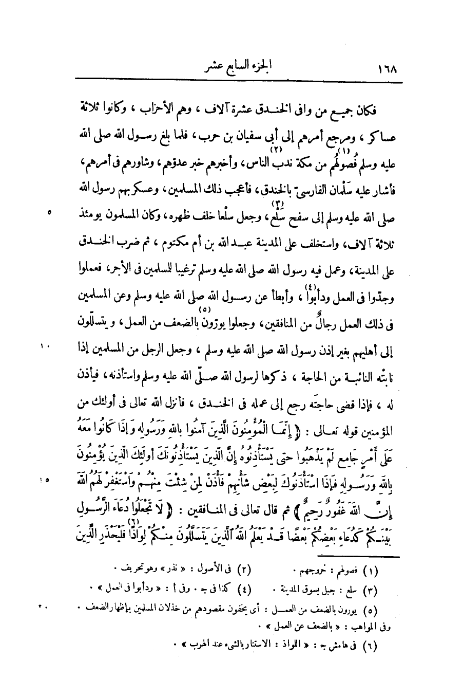 بالضعف من العمل، ويتسلّلون إلى أهليهم بغير إذن رسول الله صلّى الله عليه وسلّم، وجعل الرجل من المسلمين إذا نابته النائبة من الحاجة، ذكرها لرسول الله صلّى الله عليه وسلّم واستأذنه، فيأذن له، فإذا قضى حاجته رجع إلى عمله فى الخندق، فأنزل الله تعالى فى أولئك من المؤمنين قوله تعالى: (إِنَّمَا الْمُؤْمِنُونَ الَّذِينَ آمَنُوا بِاللَّهِ وَرَسُولِهِ وَإِذا كانُوا مَعَهُ عَلى أَمْرٍ جامِعٍ لَمْ يَذْهَبُوا حَتَّى يَسْتَأْذِنُوهُ إِنَّ الَّذِينَ يَسْتَأْذِنُونَكَ أُولئِكَ الَّذِينَ يُؤْمِنُونَ بِاللَّهِ وَرَسُولِهِ فَإِذَا اسْتَأْذَنُوكَ لِبَعْضِ شَأْنِهِمْ فَأْذَنْ لِمَنْ شِئْتَ مِنْهُمْ وَاسْتَغْفِرْ لَهُمُ اللَّهَ إِنَّ اللَّهَ غَفُورٌ رَحِيمٌ)