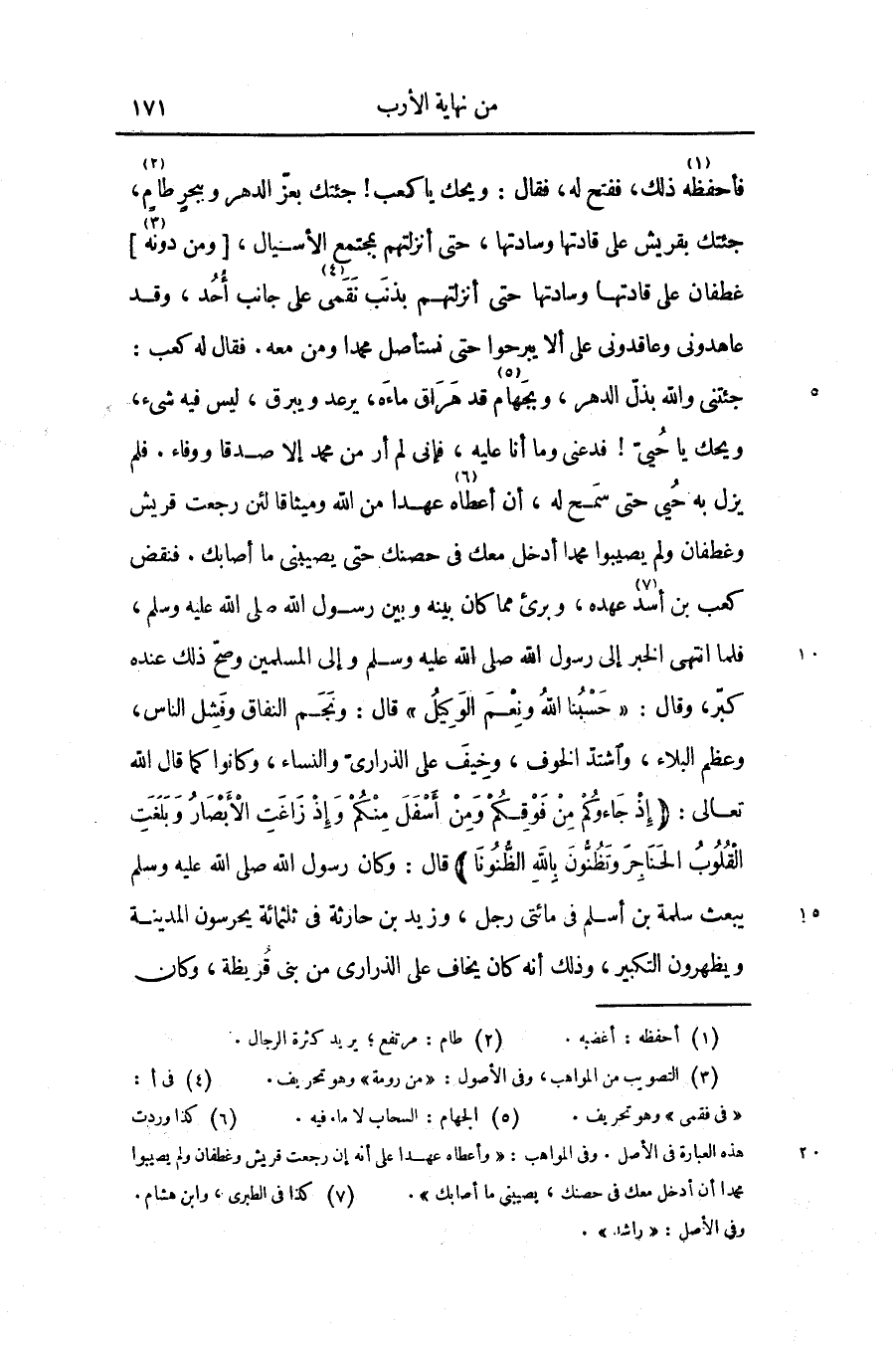 قال: ونجم النفاق وفشل الناس، وعظم البلاء، واشتدّ الخوف، وخيف على الذرارىّ والنساء، وكانوا كما قال الله تعالى: (إِذْ جاؤُكُمْ مِنْ فَوْقِكُمْ وَمِنْ أَسْفَلَ مِنْكُمْ وَإِذْ زاغَتِ الْأَبْصارُ وَبَلَغَتِ الْقُلُوبُ الْحَناجِرَ وَتَظُنُّونَ بِاللَّهِ الظُّنُونَا)