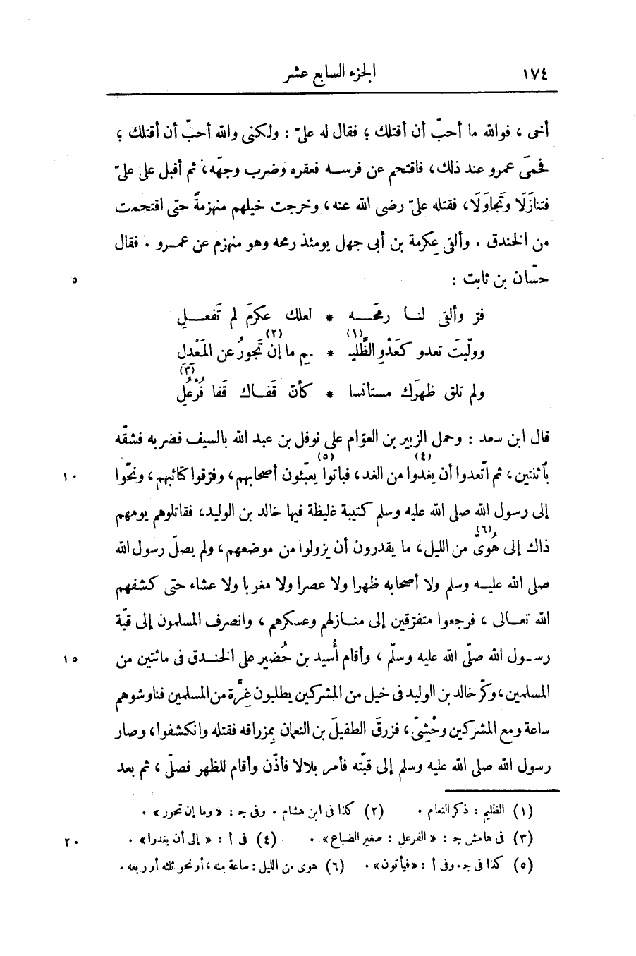 أخى، فو الله ما أحبّ أن أقتلك؛ فقال له علىّ: ولكنى والله أحبّ أن أقتلك؛ فحمى عمرو عند ذلك، فاقتحم عن فرسه فعقره وضرب وجهه، ثم أقبل على علىّ فتنازلا وتجاولا، فقتله علىّ رضى الله عنه، وخرجت خيلهم منهزمة حتى اقتحمت من الخندق. وألقى عكرمة بن أبى جهل يومئذ رمحه وهو منهزم عن عمرو. فقال حسّان بن ثابت: