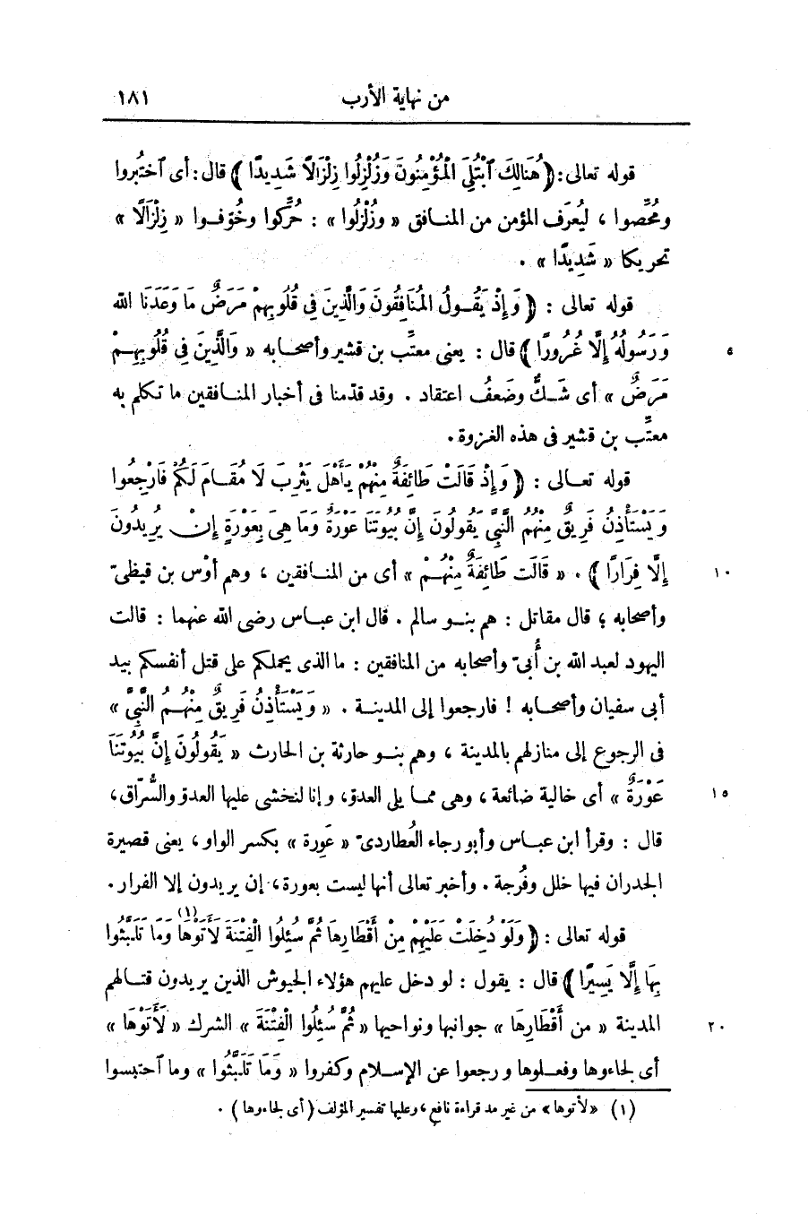 قوله تعالى: (وَإِذْ قالَتْ طائِفَةٌ مِنْهُمْ يا أَهْلَ يَثْرِبَ لا مُقامَ لَكُمْ فَارْجِعُوا وَيَسْتَأْذِنُ فَرِيقٌ مِنْهُمُ النَّبِيَّ يَقُولُونَ إِنَّ بُيُوتَنا عَوْرَةٌ وَما هِيَ بِعَوْرَةٍ إِنْ يُرِيدُونَ إِلَّا فِراراً)