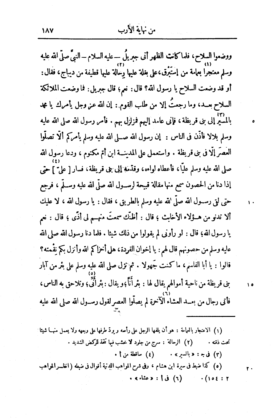 ووضعوا السلاح، فلما كانت الظهر أتى جبريل- عليه السلام- النبىّ صلّى الله عليه وسلّم معتجرا «1» بعمامة من إستبرق، على بغلة عليها رحالة «2» عليها قطيفة من ديباج، فقال: