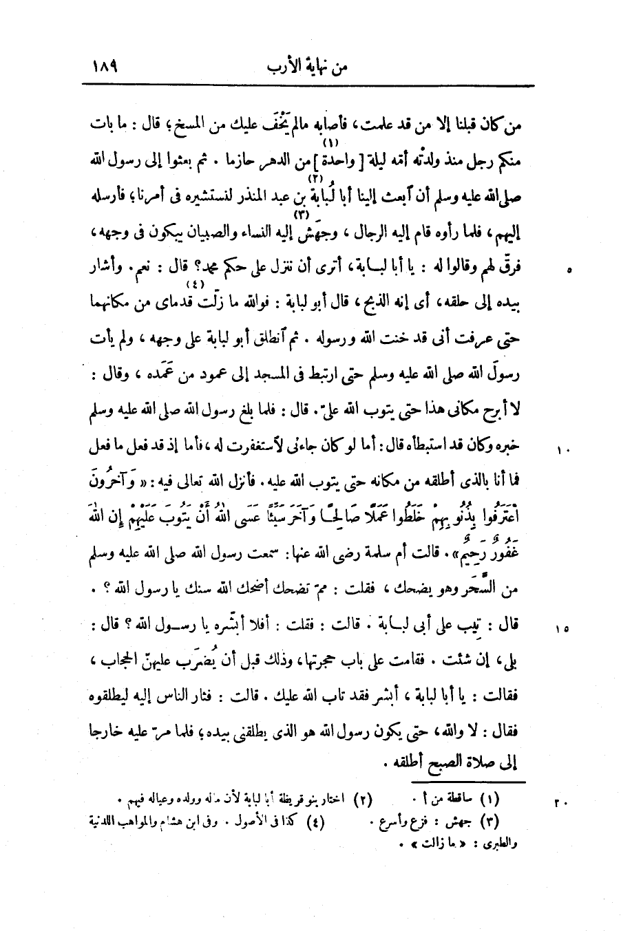 بلى، إن شئت. فقامت على باب حجرتها، وذلك قبل أن يضرب عليهنّ الحجاب، فقالت: يا أبا لبابة، أبشر فقد تاب الله عليك. قالت: فثار الناس إليه ليطلقوه فقال: لا والله، حتى يكون رسول الله هو الذى يطلقنى بيده؛ فلما مرّ عليه خارجا إلى صلاة الصبح أطلقه.