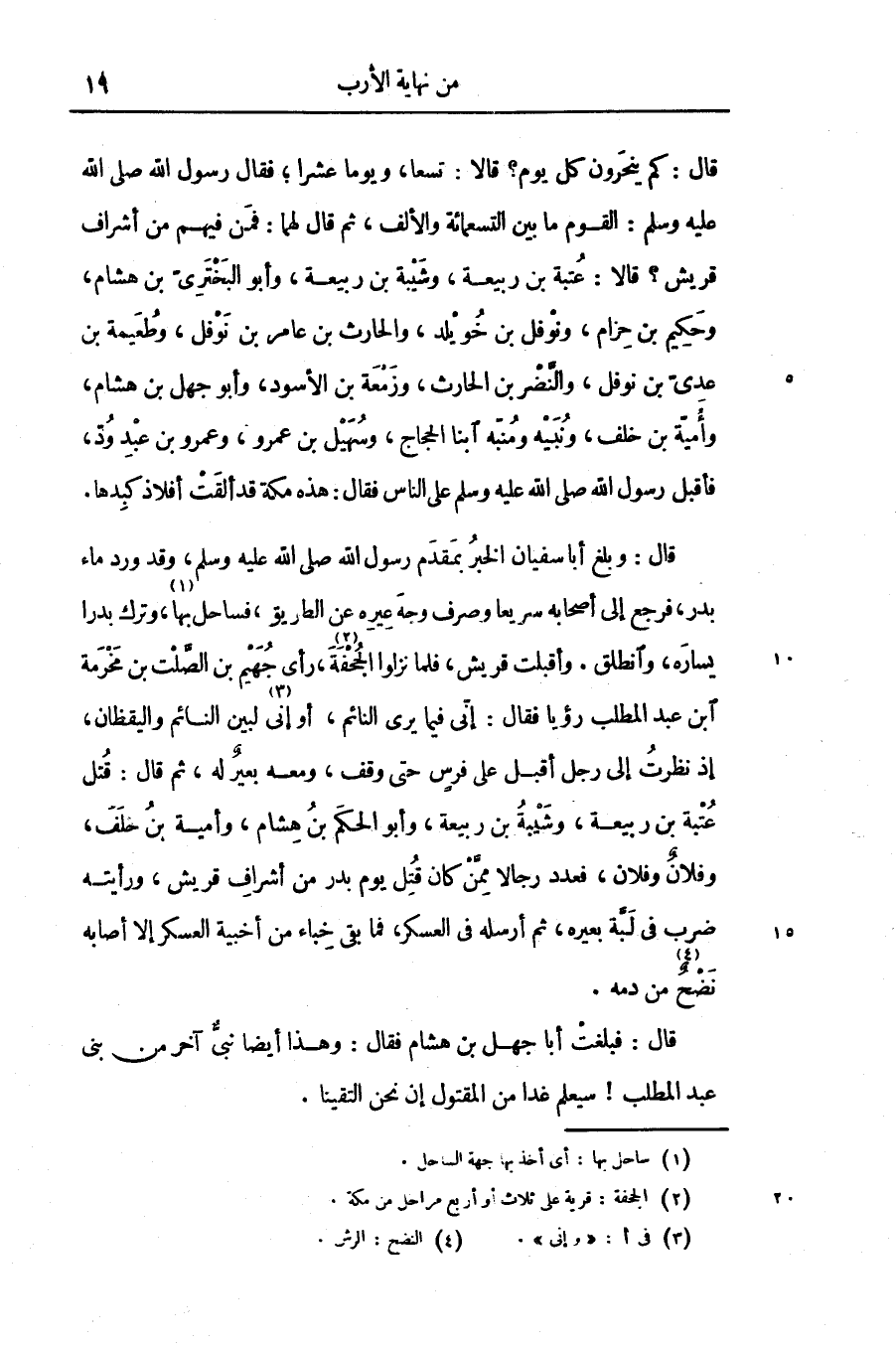 قال: كم ينحرون كل يوم؟ قالا: تسعا، ويوما عشرا؛ فقال رسول الله صلّى الله عليه وسلّم: القوم ما بين التسعمائة والألف، ثم قال لهما: فمن فيهم من أشراف قريش؟ قالا: عتبة بن ربيعة، وشيبة بن ربيعة، وأبو البخترىّ بن هشام، وحكيم بن حزام، ونوفل بن خويلد، والحارث بن عامر بن نوفل، وطعيمة بن عدىّ بن نوفل، والنّضر بن الحارث، وزمعة بن الأسود، وأبو جهل بن هشام، وأميّة بن خلف، ونبيه ومنبّه ابنا الحجاج، وسهيل بن عمرو، وعمرو بن عبد ودّ، فأقبل رسول الله صلّى الله عليه وسلّم على الناس فقال: هذه مكة قد ألقت أفلاذ كبدها.