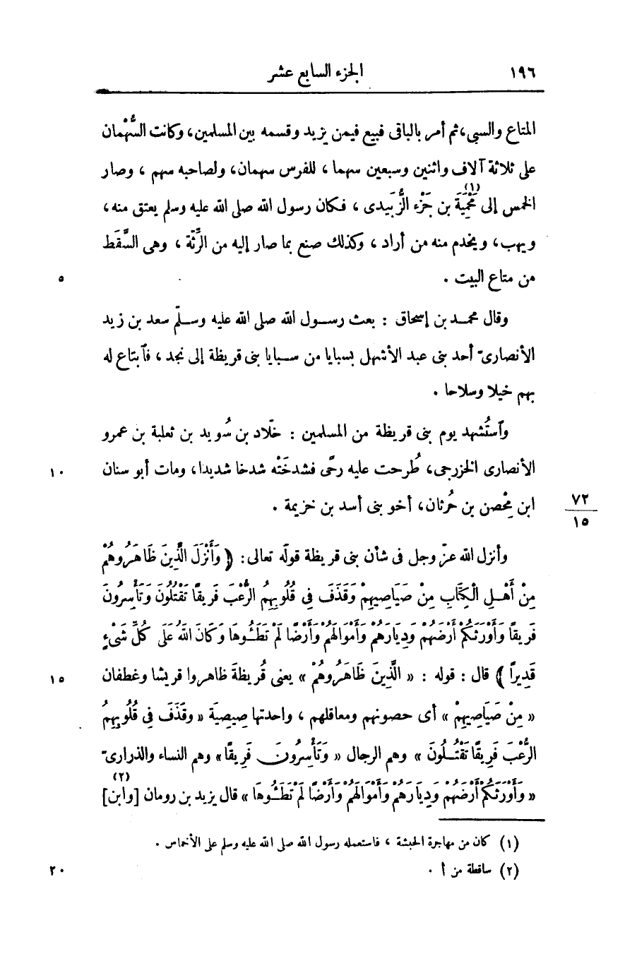 وأنزل الله عزّ وجل فى شأن بنى قريظة قوله تعالى: (وَأَنْزَلَ الَّذِينَ ظاهَرُوهُمْ مِنْ أَهْلِ الْكِتابِ مِنْ صَياصِيهِمْ وَقَذَفَ فِي قُلُوبِهِمُ الرُّعْبَ فَرِيقاً تَقْتُلُونَ وَتَأْسِرُونَ فَرِيقاً وَأَوْرَثَكُمْ أَرْضَهُمْ وَدِيارَهُمْ وَأَمْوالَهُمْ وَأَرْضاً لَمْ تَطَؤُها وَكانَ اللَّهُ عَلى كُلِّ شَيْءٍ قَدِيراً)