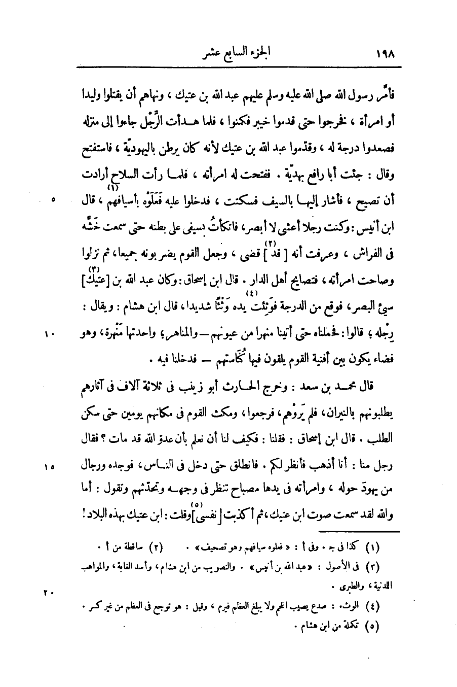 فأمّر رسول الله صلّى الله عليه وسلّم عليهم عبد الله بن عتيك، ونهاهم أن يقتلوا وليدا أو امرأة، فخرجوا حتى قدموا خيبر فكمنوا، فلما هدأت الرّجل جاءوا إلى منزله فصعدوا درجة له، وقدّموا عبد الله بن عتيك لأنه كان يرطن باليهوديّة، فاستفتح وقال: جئت أبا رافع بهديّة. ففتحت له امرأته، فلما رأت السلاح أرادت أن تصيح، فأشار إليها بالسيف فسكتت، فدخلوا عليه فعلوه بأسيافهم «1» ، قال ابن أنيس: وكنت رجلا أعشى لا أبصر، فاتكأت بسيفى على بطنه حتى سمعت خشّة فى الفراش، وعرفت أنه [قد «2» ] قضى، وجعل القوم يضربونه جميعا، ثم نزلوا وصاحت امرأته، فتصايح أهل الدار. قال ابن إسحاق: وكان عبد الله بن [عتيك «3» ] سيئ البصر، فوقع من الدرجة فوثئت «4» يده وثئا شديدا، قال ابن هشام: ويقال: