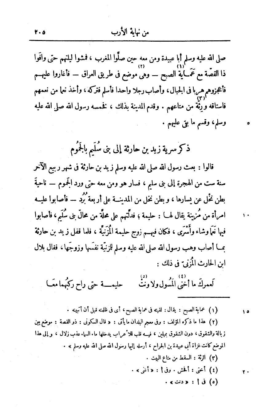 قالوا: بعث رسول الله صلّى الله عليه وسلّم زيد بن حارثة فى شهر ربيع الآخر سنة ست من الهجرة إلى بنى سليم، فسار هو ومن معه حتى ورد الجموم- ناحية بطن نخل عن يسارها، وبطن نخل من المدينة على أربعة برد- فأصابوا عليه امرأة من مزينة يقال لها: حليمة؛ فدلّتهم على محلّة من محالّ بنى سليم، فأصابوا فيها نعما وشاء وأسرى، فكان فيهم زوج حليمة المزنيّة، فلما قفل زيد بن حارثة بما أصاب وهب رسول الله صلّى الله عليه وسلّم للمزنيّة نفسها وزوجها، فقال بلال ابن الحارث المزنىّ فى ذلك:
