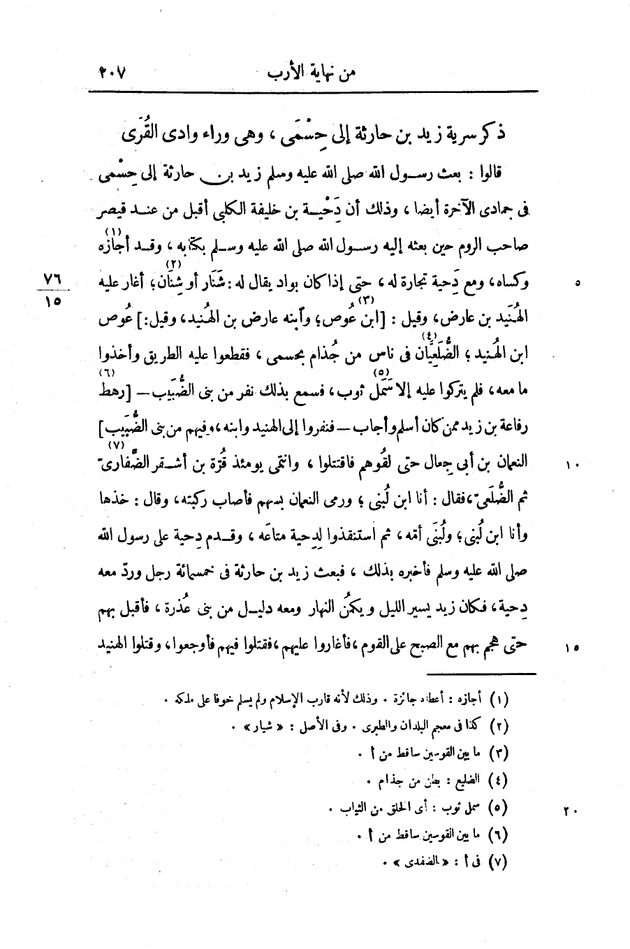 قالوا: بعث رسول الله صلّى الله عليه وسلّم زيد بن حارثة إلى حسمى فى جمادى الآخرة أيضا، وذلك أن دحية بن خليفة الكلبى أقبل من عند قيصر صاحب الروم حين بعثه إليه رسول الله صلّى الله عليه وسلّم بكتابه، وقد أجازه «1» وكساه، ومع دحية تجارة له، حتى إذا كان بواد يقال له: شنار أو شنان «2» ؛ أغار عليه الهنيد بن عارض، وقيل: [ابن «3» عوص؛ وابنه عارض بن الهنيد، وقيل:] عوص ابن الهنيد؛ الضّلعيّان «4» فى ناس من جذام بحسمى، فقطعوا عليه الطريق وأخذوا ما معه، فلم يتركوا عليه إلا سمل «5» ثوب، فسمع بذلك نفر من بنى الضّبيب-[رهط «6» رفاعة بن زيد ممن كان أسلم وأجاب- فنفروا إلى الهنيد وابنه، وفيهم من بنى الضّبيب] النعمان بن أبى جعال حتى لقوهم فاقتتلوا، وانتمى يومئذ قرّة بن أشقر الضّفارىّ «7» ثم الضّلعىّ، فقال: أنا ابن لبنى؛ ورمى النعمان بسهم فأصاب ركبته، وقال: خذها وأنا ابن لبنى؛ ولبنى أمّه، ثم استنقذوا لدحية متاعه، وقدم دحية على رسول الله صلّى الله عليه وسلّم فأخبره بذلك، فبعث زيد بن حارثة فى خمسمائة رجل وردّ معه دحية، فكان زيد يسير الليل ويكمن النهار ومعه دليل من بنى عذرة، فأقبل بهم حتى هجم بهم مع الصبح على القوم، فأغاروا عليهم، فقتلوا فيهم فأوجعوا، وقتلوا الهنيد