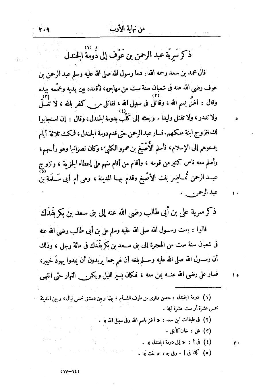 قال محمد بن سعد رحمه الله: دعا رسول الله صلّى الله عليه وسلّم عبد الرحمن بن عوف رضى الله عنه فى شعبان سنة ست من مهاجره، فأقعده بين يديه وعمّه بيده وقال: اغز بسم الله، وقاتل «2» في سبيل الله، فقاتل من كفر بالله، لا تغلّ «3» ولا تغدر، ولا تقتل وليدا. وبعثه إلى كلب «4» بدومة الجندل، وقال: إن استجابوا لك فتزوج ابنة ملكهم. فسار عبد الرحمن حتى قدم دومة الجندل، فمكث ثلاثة أيام يدعوهم إلى الإسلام، فأسلم الأصبغ بن عمرو الكلبىّ، وكان نصرانيا وهو رأسهم، وأسلم معه ناس كثير من قومه، وأقام من أقام منهم على إعطاء الجزية، وتزوج عبد الرحمن تماضر بنت الأصبغ وقدم بها المدينة، وهى أم أبى سلمة «5» بن عبد الرحمن.